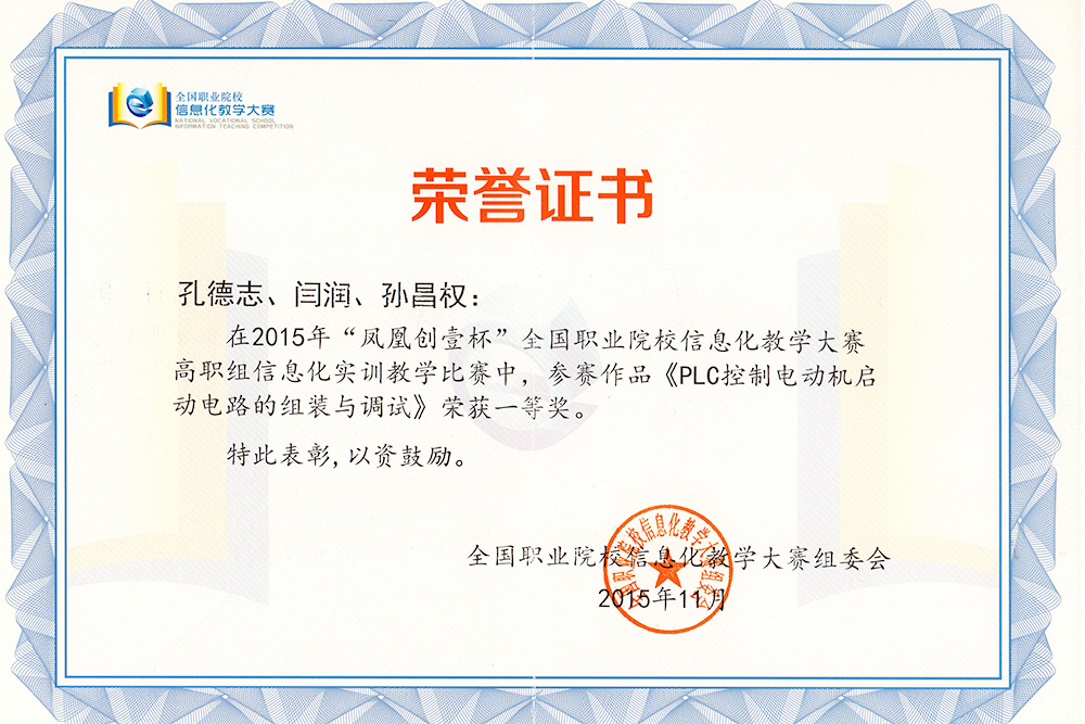 11月6日-9日,2015年“凤凰创壹杯”全国职业院校信息化教学大赛在南京高等职业技术学校举行。永利官网机电工程系孔德志、闫润和孙昌权三位老师的参赛作品《PLC控制电动机启动电路的组装与调试》脱颖而出,以第一名的成绩获得高职组“信息化实训教学比赛”一等奖,并作为该组代表上台领奖。