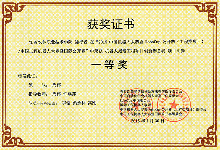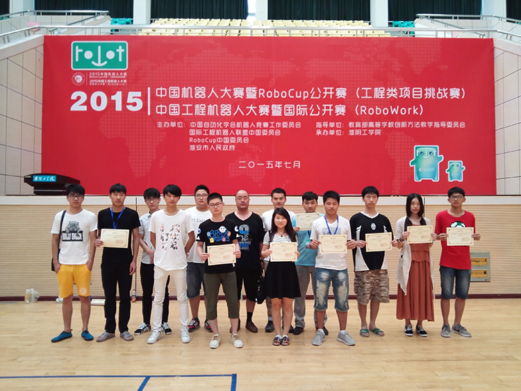 7月28-30日,2015年中国机器人大赛暨robocup公开赛(工程类项目挑战赛)/2015年中国工程机器人大赛暨国际公开赛(robowork)在淮阴工学院举行,永利官网信息工程系周伟、仲瑶等老师带领的团队,不畏强手,奋力拼搏,取得了3个一等奖、2个二等奖、3个三等奖的好成绩。 中国机器人大赛暨robocup公开赛由教育部创新技术委员会、中国自动化学会、RoboCup中国委员会国际工程机器人联盟主办,是中国最具影响力的机器人技术大赛、学术大会和博览盛会,从1999年开始至今,每年举办一届,今年已是第17届。本届赛事共吸引了解放军理工大学、山东大学、北京邮电大学等171所学校参加,参赛总人数近4000人。