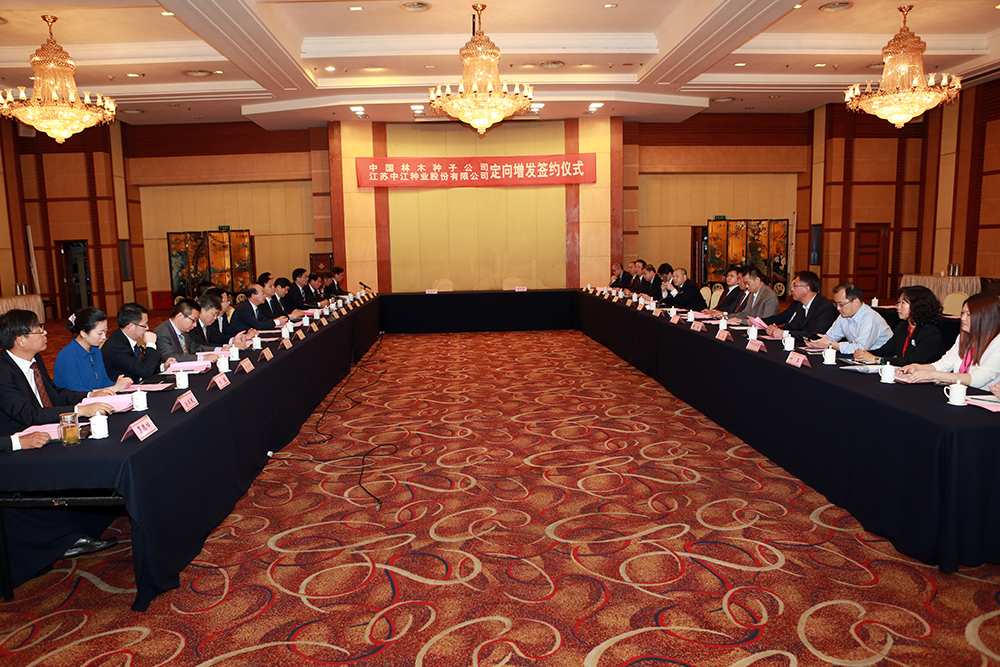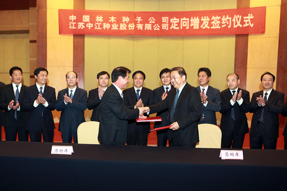 近日, 中江种业股份有限公司与中国林木种子公司定向增发签约仪式在南京举行。中国林业集团公司总经理、党委书记宋权礼、副总经理朱成庆,江苏省农业委员会主任吴沛良、副主任张坚勇、徐惠中,学院党委书记俞卫东,中国林木种子公司总经理朱伟成,中江种业董事长王福银、总经理蒋红云等出席了签约仪式。 俞卫东书记在欢迎辞中指出,中国林木种子公司增资入股中江种业是强强联手打造种业龙头企业的有力举措,也是切实推进民族种业发展的具体行动。相信林木种子公司的增资扩投,将会给中江种业的发展插上腾飞的翅膀。学院作为中江种业的实际控制人,将一如既往的给予支持,并积极谋划公司未来发展。 宋权礼总经理在发言中提出,2015年中林集团按照国务院、国资委的工作要求,创新发展模式,转变增长方式,加快种苗生产、农作物种子和园林绿化工程领域步伐,种业将成为中林集团新的业务板块。相信中江种业与中林集团合作后,一定会有更大的进步和更快的发展。 最后,吴沛良主任发表了重要讲话,对于双方的合作表示了良好的祝愿,他指出,此次合作将有力的推动中江种业进一步做大做强,同时对于进一步加快种业强省,支持企业融资上市具有重要的意义。他希望中江种业借此东风,发扬实干和创新精神,把握产业发展规律,完善体制机制,借力发展,育优良品种、树一流品牌、做优质企业。 中国林木种子公司总经理朱伟成,公司董事长王福银分别代表双方企业签订了合作协议书。 农民日报、新华日报、江苏卫视等多家新闻媒体对活动进行了报道。