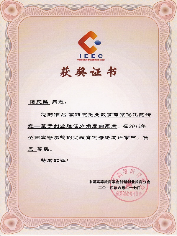 6月27日,中国高等教育学会创新创业教育分会2014年工作年会在西南交大犀浦校区图书馆二号报告厅隆重召开。永利官网在大会上被推选为中国高等教育学会创新创业教育分会第二届理事单位,喜获“全国高等学校创业教育研究与实践先进单位”荣誉称号,陈月容老师荣获“全国高等学校创业教育先进个人”,朱晓宦老师的论文《充分发挥高校科研优势以促进大学生创业》、何永鹏老师的论文《高职院创业教育体系优化的研究—基于创业胜任力角度的思考》均获得优秀论文评选三等奖。