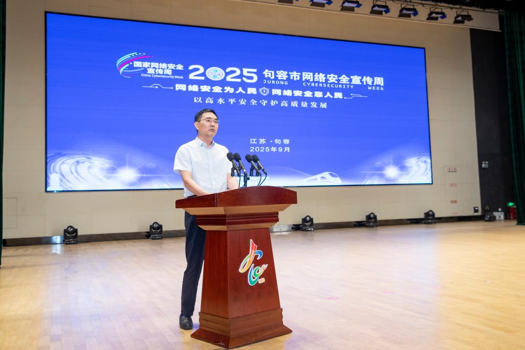 9月17日,2025级“开学第一课”暨句容市网络安全宣传周启动仪式在学院大学生艺术中心举行。活动将爱国主义教育与网络安全宣传深度融合,为全体新生带来一场别开生面的“入学教育”。学院党委副书记、院长潘永圣,党委副书记曹仁勇,句容市委常委、宣传部部长胡光亮出席活动。