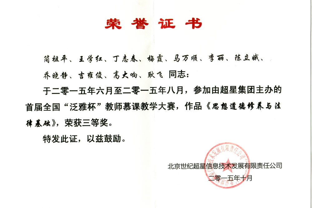 此次大赛由超星集团主办,历时4个月,共征集到141件作品,经过网络点赞和专家点评评选出优秀作品。永利官网《思想道德修养与法律基础》慕课根据教学目标和学生现状,充分利用网络学习平台和移动平台,拍摄视频48个,编写脚本48个,制作课件30个,并有效整合相关课程内容,将动画、视频、微课、闯关游戏以及量化测评软件、教师备课资源和工具等融会集成,实现教与学过程的最优化。