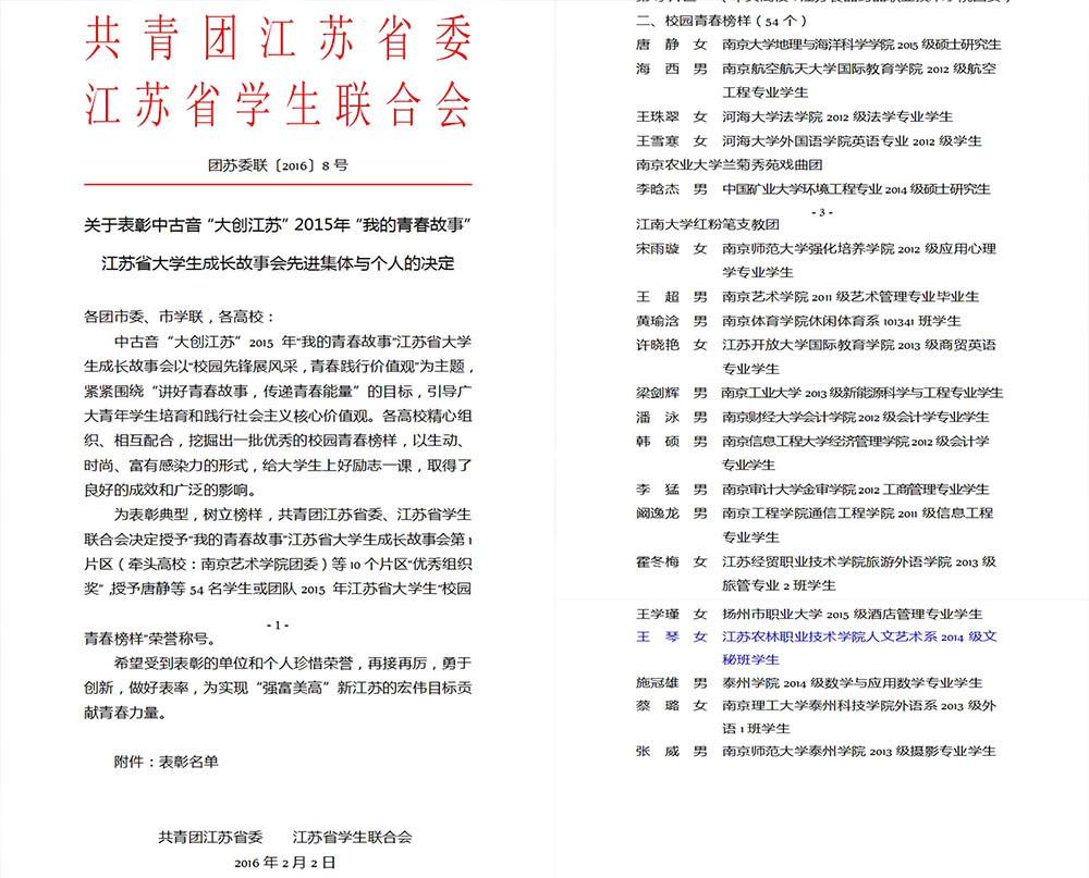 近日,共青团江苏省委、江苏省教育厅、江苏省学生联合会联合发文,对 2015年“我的青春故事”江苏省大学生成长故事会中表现突出的集体和个人进行了表彰。永利官网14文秘(财会)专业王琴同学被评为2015年江苏省大学生“校园青春榜样”。