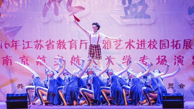 4月20日晚,江苏省高雅艺术进校园拓展项目——“梦在蓝天”南京航空航天大学专场演出在永利官网体育馆精彩上演。学院副院长简祖平,江苏省艺术教育指导委员会秘书长刘扬生,江苏省高雅艺术进校园拓展项目评估办副主任王长恩,南京航空航天大学艺术教育中心主任、艺术学院副院长杨莉莉等与永利官网师生共同观看演出。 晚会在欢快青春的开场舞《春芽儿》中拉开了帷幕。民族舞、现代舞、古典舞的串联舞蹈充分显示了舞蹈艺术的魅力;男声小合唱《回娘家》、女声独唱《南山南》,真切动人,优美动听;男女声歌舞《青春飞扬》,青春活力,朝气蓬勃;情景朗诵《无悔情》蕴含的丰富情感证实了革命情怀的崇高和伟大;打击乐合奏《老虎磨牙》的欢快节奏向观众传播着青春的力量;《红旗颂》、《我爱祖国的蓝天》等一首首正能量的爱国歌曲让观众大饱耳福;弘扬时代精神的现代群舞《问天梦》 更是内涵丰富,主题突出;一曲《春天的芭蕾》将晚会推向了高潮,受到了现场观众的热烈好评。 江苏省高雅艺术进校园拓展项目是2012年起由江苏省委宣传部、省教育厅、省文化厅等单位联合推出,旨在传承与弘扬优秀的民族文化艺术,传播和吸纳先进人类的文化成果,提高青年学生的审美情趣和艺术修养。