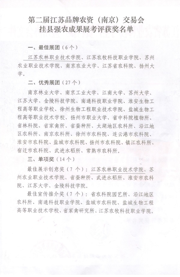 日前,江苏省农业科技与生产资料推广应用协会发文(苏农资协【2016】5号)对在第二届江苏品牌农资(南京)交易会挂县强农成果展中表现突出的单位予以表彰。永利官网获得最佳展团奖和最佳展示创意奖。