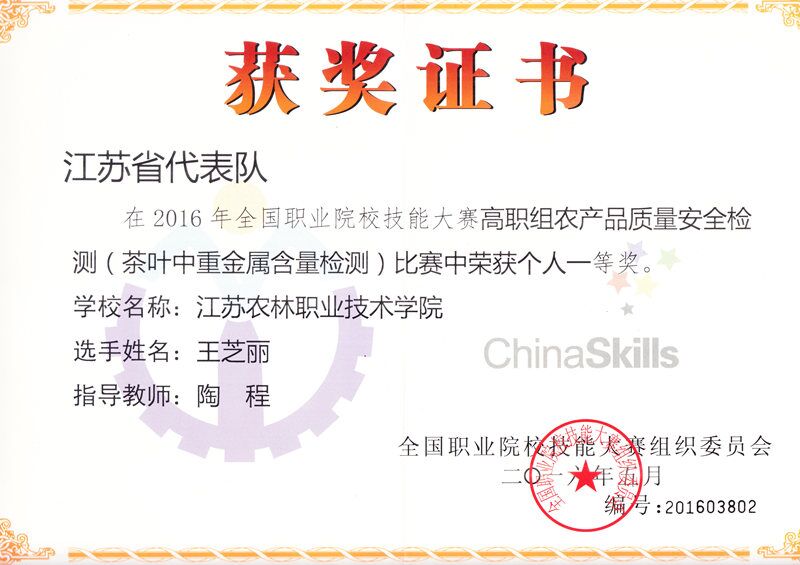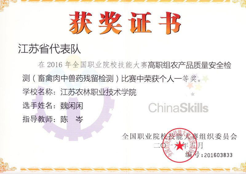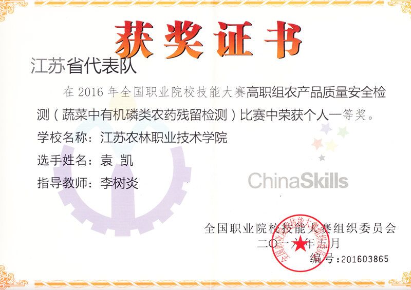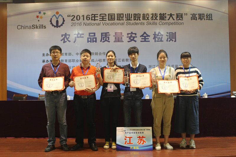 5月19日-23日,2016年全国职业院校技能大赛农产品质量安全检测赛项在浙江经贸职业技术学院隆重举行。永利官网生物工程系3名学生代表江苏省参赛,经过激烈角逐,袁凯同学荣获“蔬菜中有机磷类农药残留的检测”一等奖;魏闲闲同学荣获“畜禽肉中氟喹诺酮类兽药残留的检测”一等奖;王芝丽同学荣获“茶叶中重金属含量的检测”一等奖;李树炎、陈岑、陶程3位老师获“优秀指导老师”称号,永利官网成为唯一囊括三项赛事金奖的高职院校。