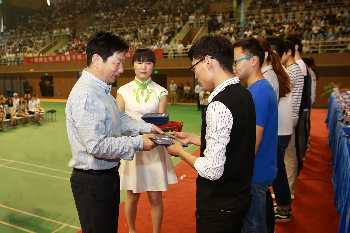巫建华院长在致辞中饱含深情地带领大家回顾了三年的点滴历程,表达了对他们的良好祝愿。同时,他代表母校对毕业生们提出了殷切期盼,希望他们要修身立德,学会感恩;要志存高远,树立理想;要脚踏实地,求真务实;要勇于创新,敢为人先;要终身学习、追求卓越。随后,他为毕业生代表颁发了毕业证书,主席台前排就坐的领导与毕业生代表合影留念。