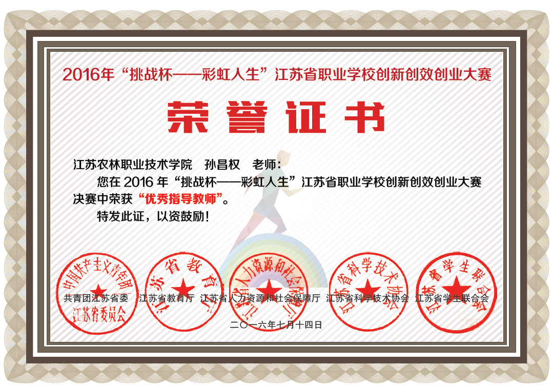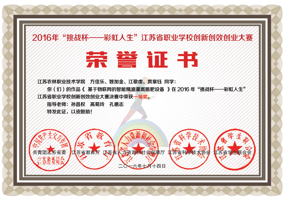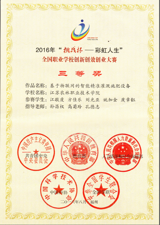 在今年5月举办的2016年“挑战杯——彩虹人生”江苏省职业学校创新创效创业大赛中,“基于物联网精准灌溉施肥”作品荣获全省一等奖并成功入围全国职业学校创新创效创业大赛,孙昌权老师荣获省赛“优秀指导教师”。此外,作品《绿园秧草收割机》荣获全省三等奖。