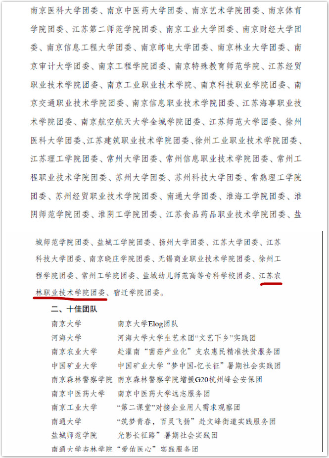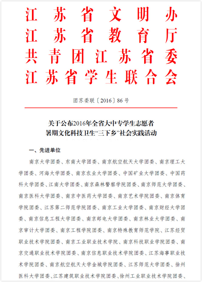 日前,中共江苏省委宣传部、江苏省文明办、江苏省教育厅、共青团江苏省委、江苏省学生联合会联合下发《2016年全省大中专学生志愿者暑期文化科技卫生“三下乡”社会实践活动先进集体和个人名单的通知》(团苏委联〔2016〕86 号),永利官网戚仙玉、杨廷耀两位同学荣获“先进个人”;郭庆、刘梅、傅浩兰等三位同志荣获“先进工作者”;“五彩课堂”暑期社会实践团、“红色堡垒村”红色文化实践团荣获“优秀团队”;永利官网团委荣获“先进单位”。
