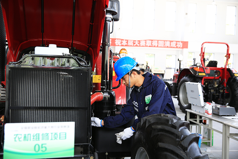 农机维修赛项为大型轮式拖拉机综合故障诊断与排除项目、履带自走式全喂入联合收割机综合故障诊断与排除项目两个部分,竞赛选手须进行全部项目的操作技能考核。比赛现场气氛紧张严肃,选手们细致规范地进行各项操作,陆续在规定时间内进行故障诊断与项目排除。裁判们严格评分、一丝不苟,保证了比赛的公正与顺利进行。