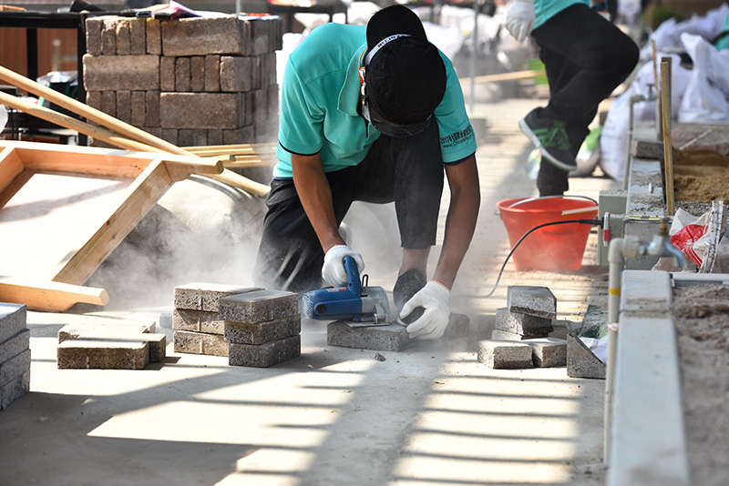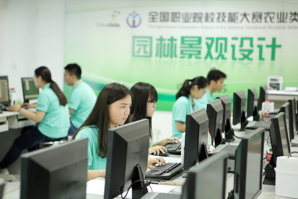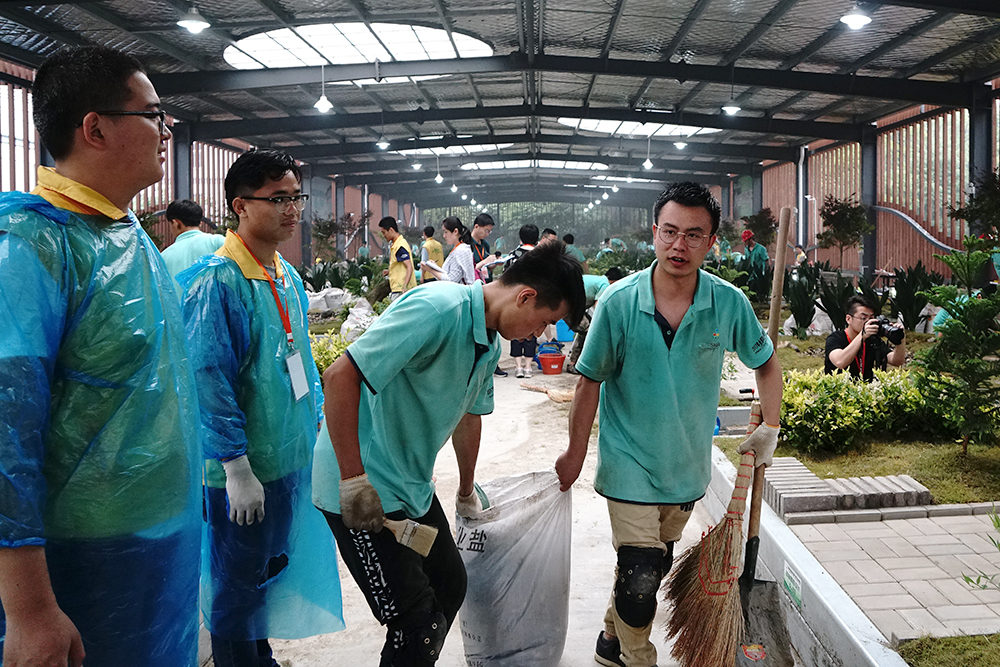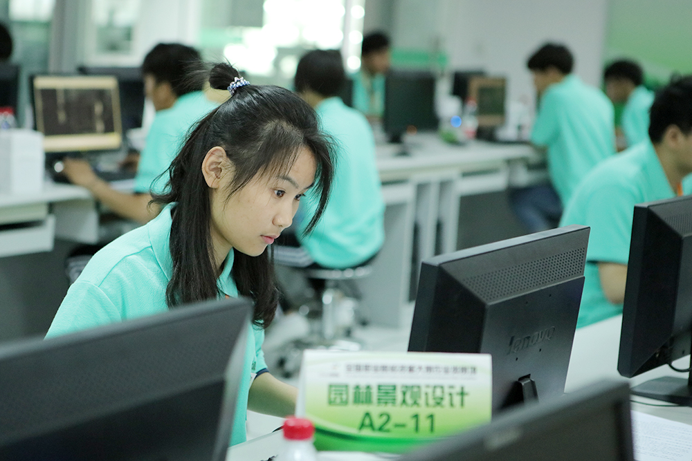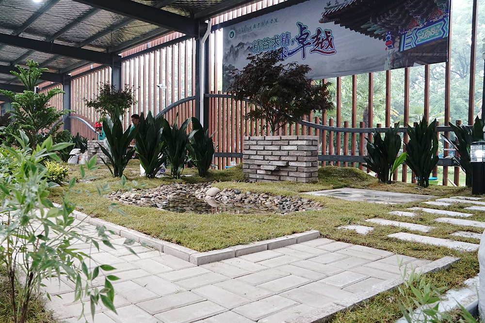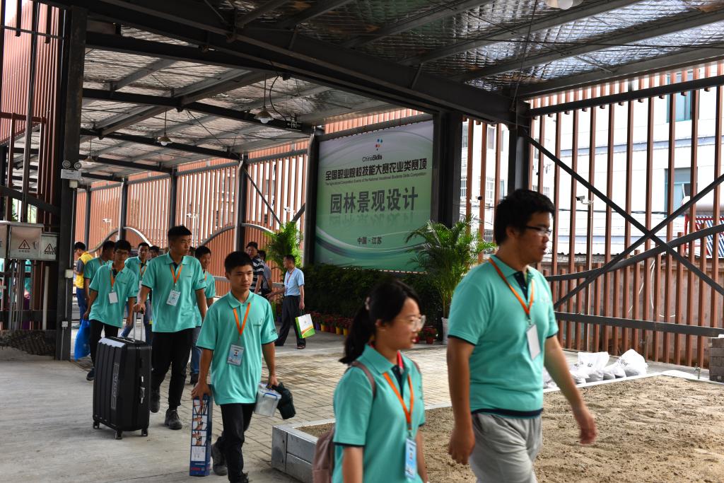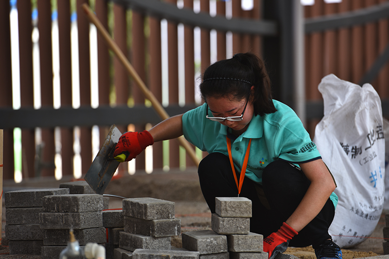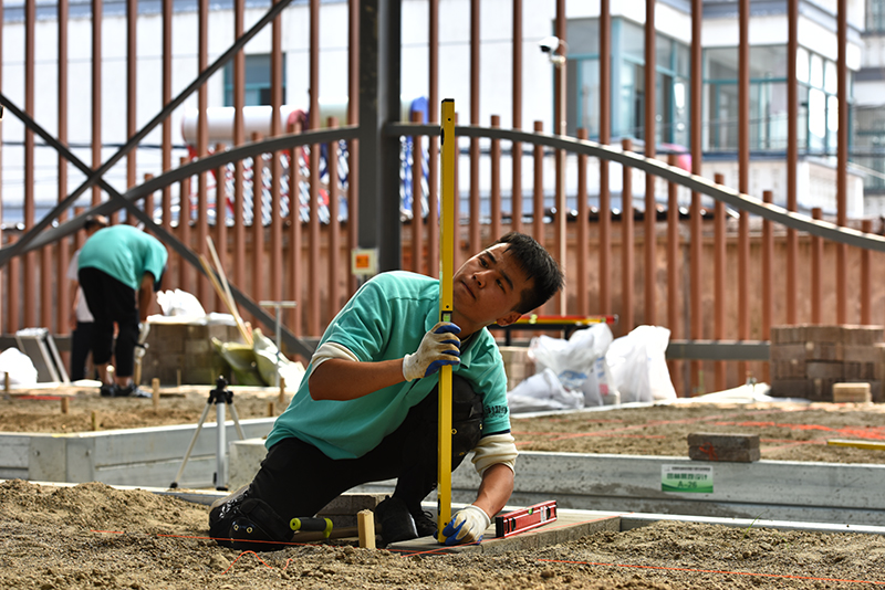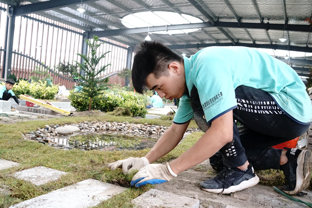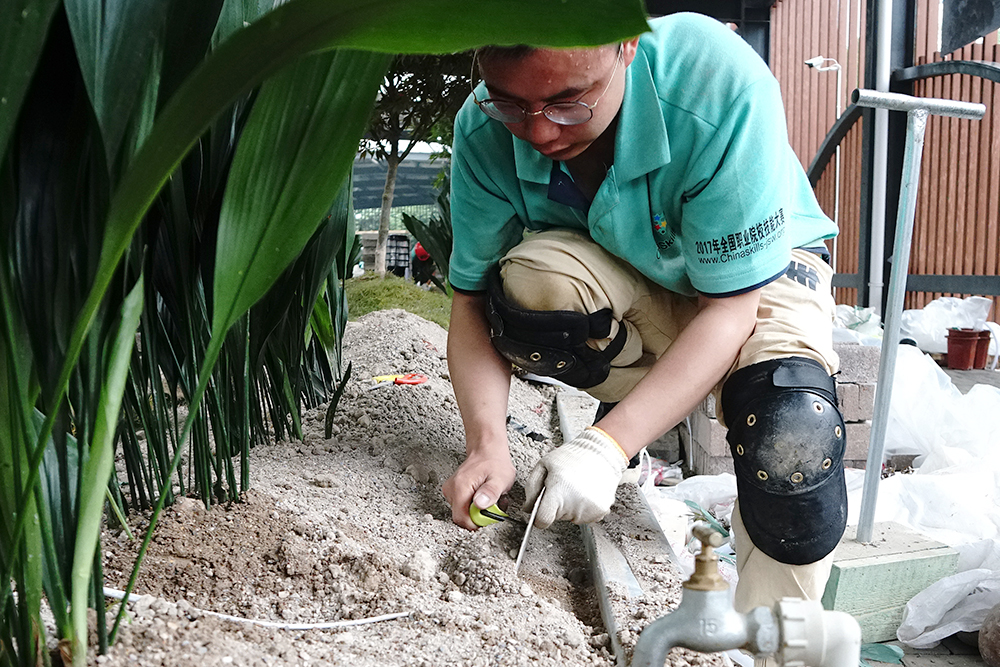 与以往赛项不同的是,本次园林景观设计赛项对接世界技能大赛,增加了园林工程施工部分,选手须按照编制好的计划,参照规划布局和高程式细节以及局部图纸等,使用工具对园林景观进行安装、布置和维护。比赛现场“硝烟四起”,选手们利用手中的工具或挖土、或砌墙,实地创造园林景观。裁判在裁判长的领导和监督下严格评分、一丝不苟,保证了比赛的公正与顺利进行。