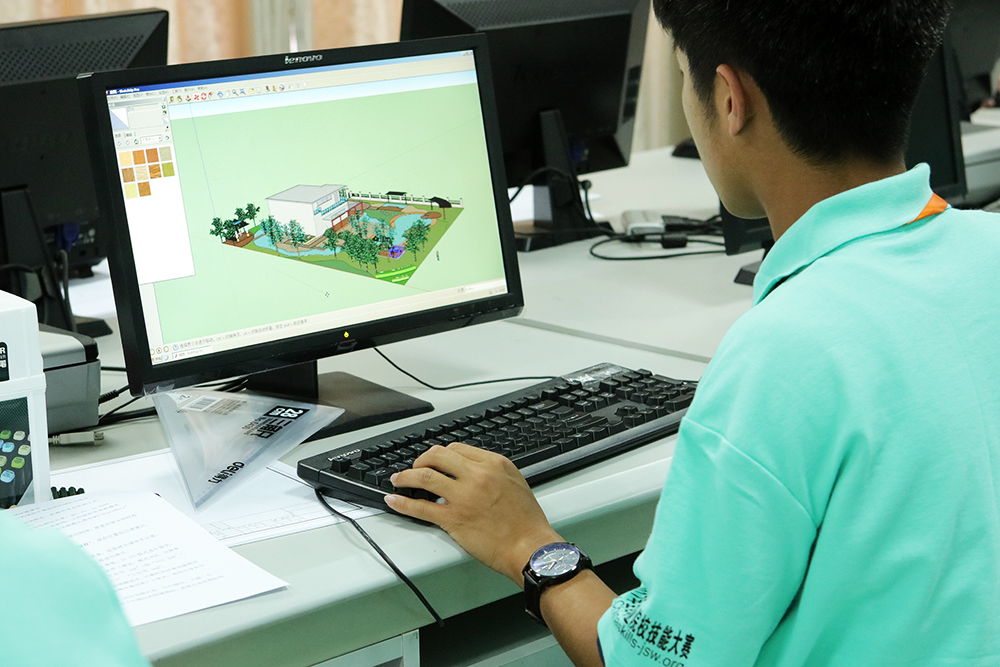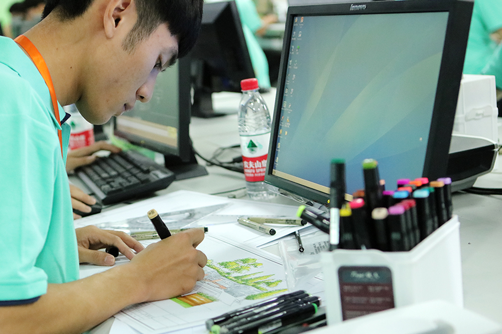 园林景观设计赛项包括园林景观设计与园林工程施工两个部分。园林景观设计部分为某庭院景观设计,总面积为2000㎡,园林工程施工部分面积为20平方米,是根据提供的施工图进行园林工场施工。园林景观设计部分可以根据选手自身特长选择手绘或利用计算机设计软件对给定庭院绿地进行景观设计,包括总平面图、局部效果图、鸟瞰图、设计说明等,最后整合成一个JPG文件的展板。