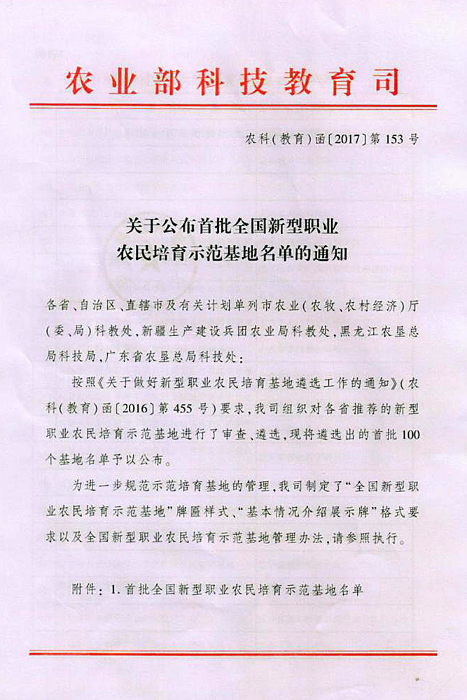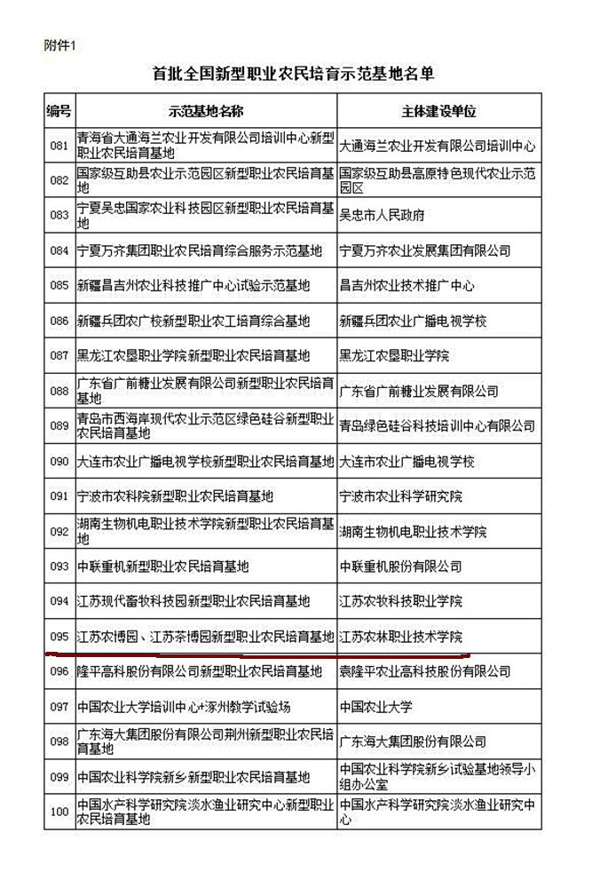 近日,农业部发布了《关于公布首批全国新型职业农民培育示范基地名单的通知》(农科函〔2017〕第153号),永利官网两大校内实训基地江苏农博园、江苏茶博园成功入选首批百所全国新型职业农民培育示范基地。