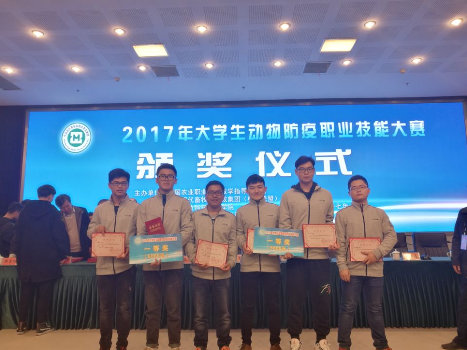 11月25日—26日,由全国农业职业教育教学指导委员会、中国现代畜牧业职教集团共同主办的2017年大学生动物防疫职业技能大赛决赛在江苏农牧科技职业学院举行。永利官网畜牧兽医学院选派的两支代表队葛广玉、丁明飞、包华夏(一队)、王兴明、夏继涛、马新新(二队)凭借扎实的理论知识及过硬的操作技术,一并斩获一等奖。徐云明、李定国、马国辅、赵勇四位老师获优秀指导教师荣誉。