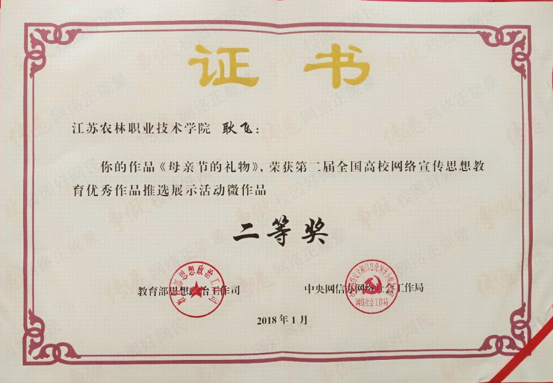 经永利官网选送和省教育厅遴选推荐,由信息工程学院师生创作的微电影作品《母亲节的礼物》,在第二届全国高校网络宣传思想教育优秀作品推选展活动中荣获二等奖。