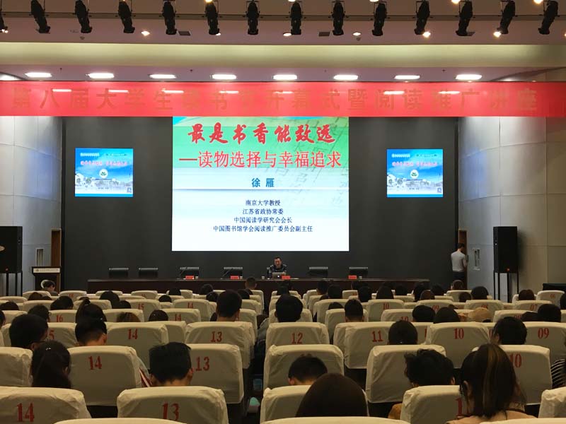 开幕式后,南京大学徐雁教授为来自各学院的300余名师生带来了题为《最是书香能致远—读物的选择与幸福生活》的阅读推广讲座。