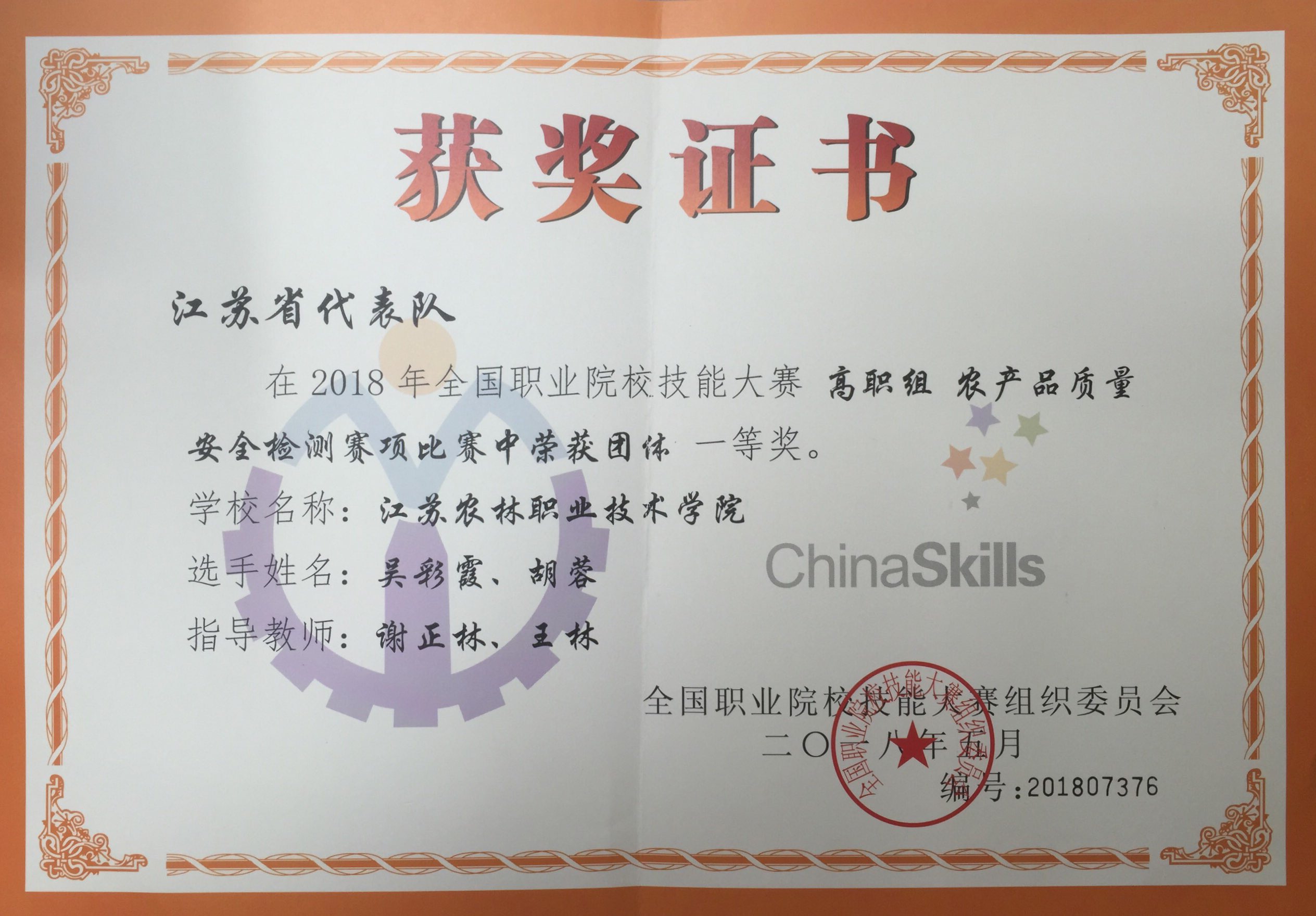 6月10日至13日,全国职业院校技能大赛“农产品质量安全检测”赛项在湖北生物科技职业学院举行。代表江苏省参赛的永利官网茶与食品科技学院胡蓉和吴彩霞两名同学凭借扎实的专业功底、过硬的操作技能和稳定的心理素质,荣获了此次大赛的一等奖。谢正林和王林两位老师荣获优秀指导老师称号。