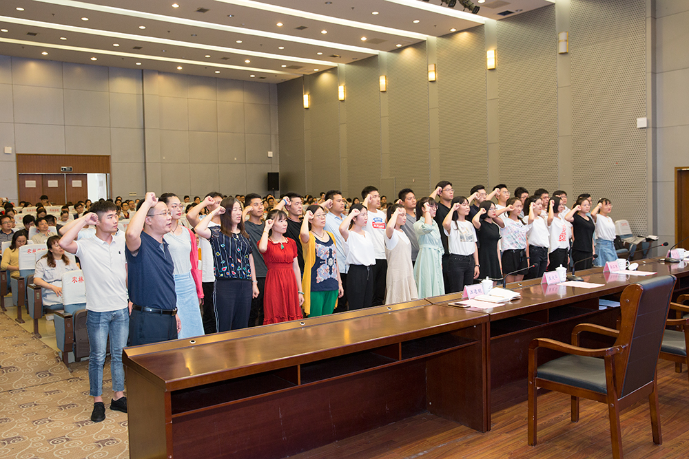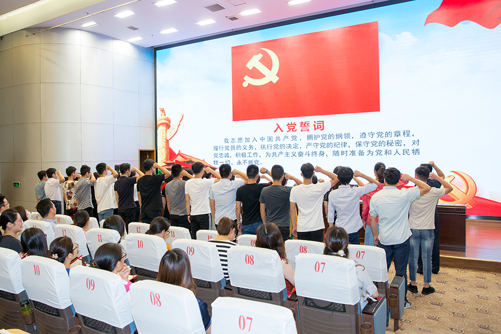 在庄严的国歌声中,大会拉开序幕。学院党委委员、副院长曹仁勇同志宣读了学院党委《关于表彰2017-2018学年优秀共产党员、优秀党务工作者的决定》。优秀共产党员代表金文忻、优秀党务工作者代表谢春芹和新党员代表岳子豪分别作了发言。20名新党员代表在学院党委委员、办公室主任毕德全同志的带领下进行入党宣誓。