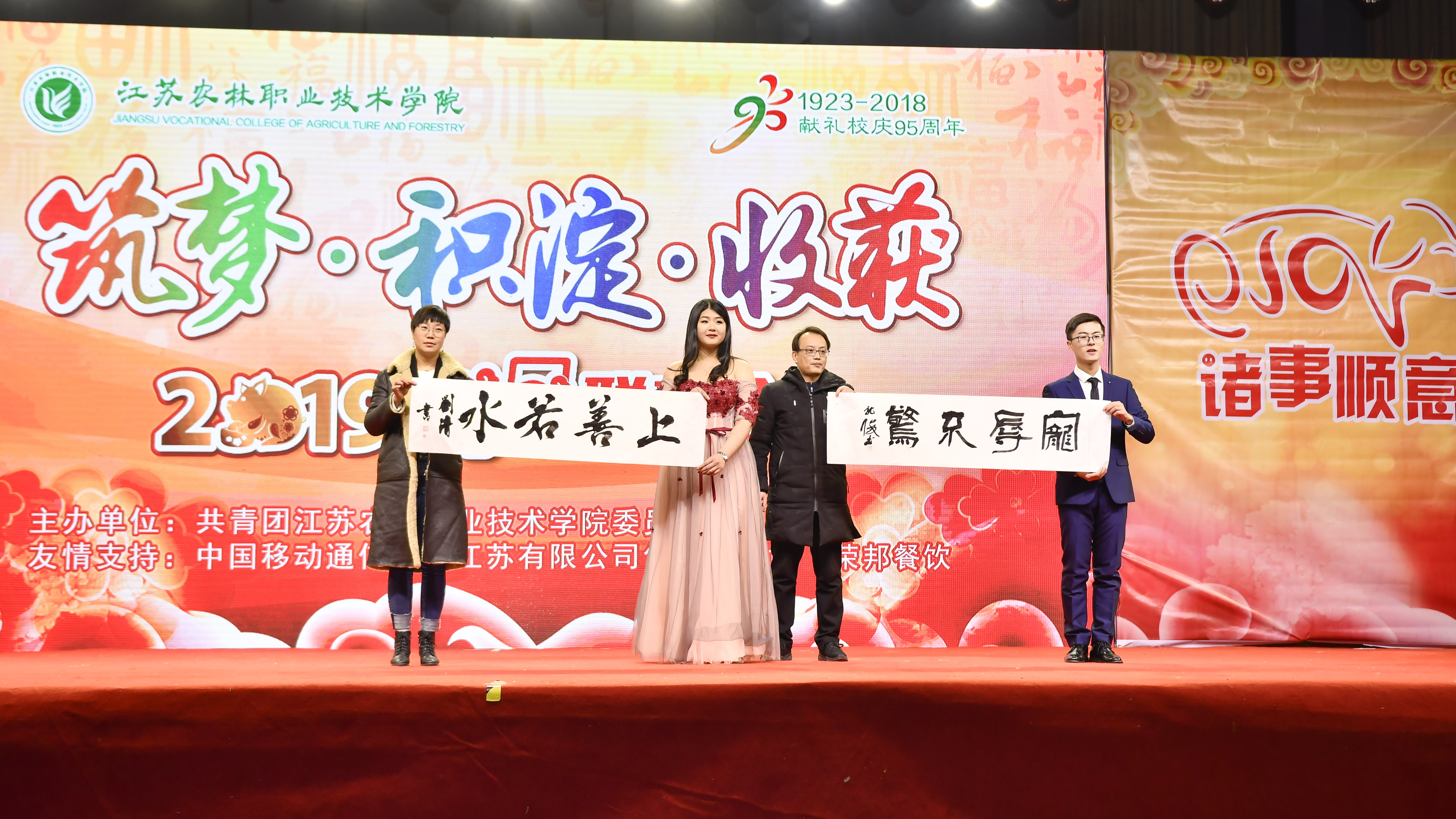 晚会在歌舞《盛世花开》中拉开了序幕,歌舞《春归了》唯美动人,舞蹈《张灯结彩》喜庆热烈,歌曲联唱青春飞扬,小品《二一添作五》在笑声中体味孝道,藏族舞蹈《洗衣歌》表达了对人民解放军的深深谢意,民乐书法舞蹈混搭表演《荷塘月色》展现了传统文化的深厚魅力。特别邀请的江苏省京剧院、扬州曲艺研究所和战旗军旅文工团的各位艺术家也为师生带来了精彩的表演,一曲扬州清曲《黄莺儿·风》旋律优美、形态多姿,现代京剧选段《家住安源》深情演绎革命故事,凤阳花鼓《春到小岗》展现改革开放四十年的伟大成就,联欢会在歌舞《不忘初心》中圆满落下帷幕。整场演出精彩不断,高潮迭起,展现了农林师生良好的精神风貌和校园文化建设成果,唱响了激昂奋进的主旋律,为全校师生献上了一台精彩的新年文艺大餐。