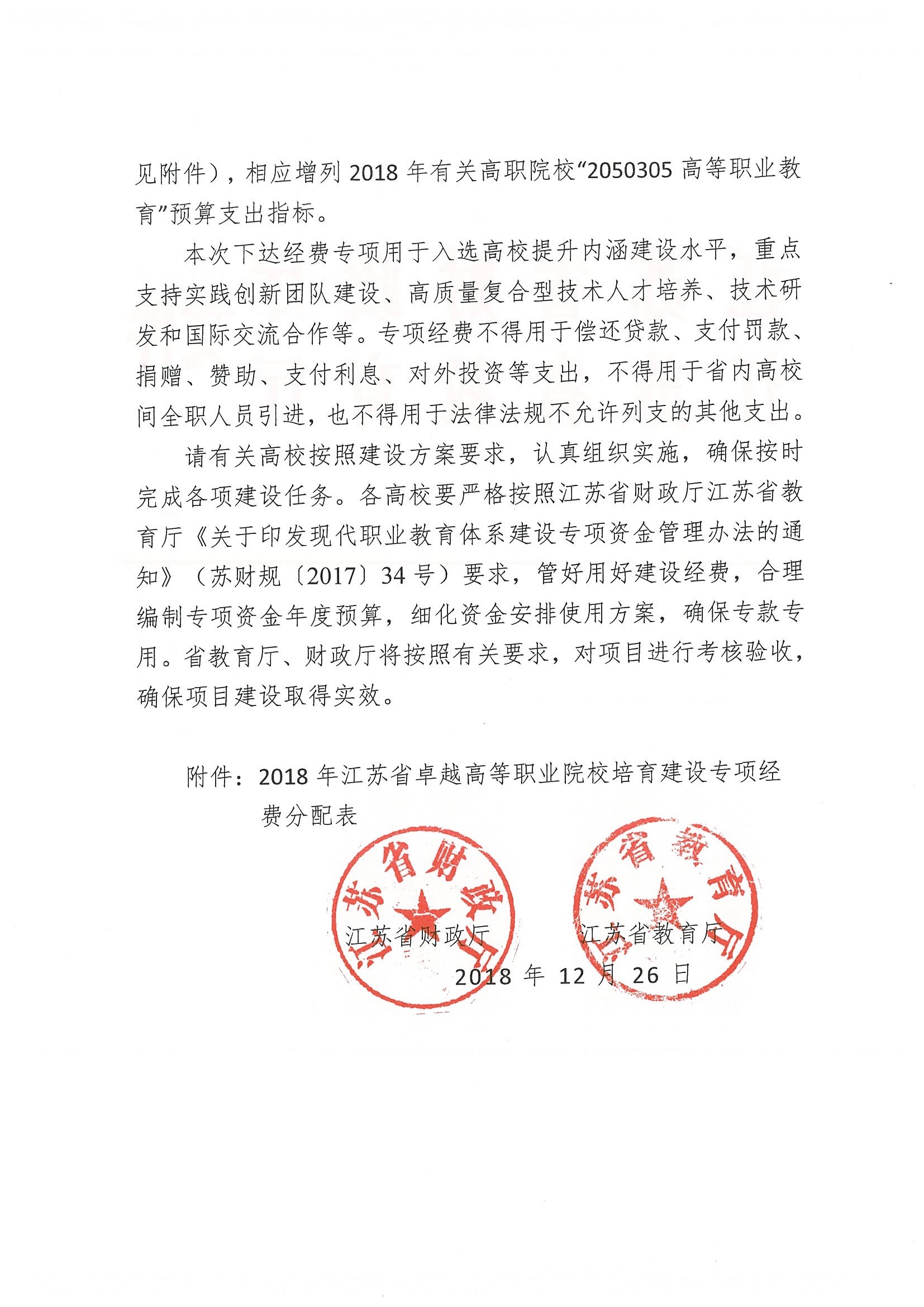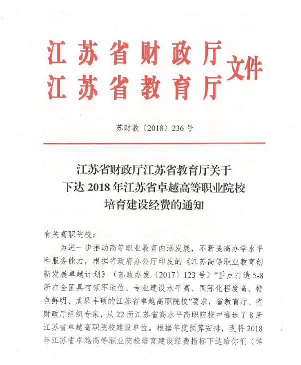 根据省政府办公厅印发的《江苏高等职业教育创新发展卓越计划》(苏政办发(2017)123号)“重点打造5-8所在全国具有领军地位、专业建设水平高、国际化程度高、特色鲜明、成果丰硕的江苏省卓越高职院校”的目标要求,省教育厅、省财政厅组织专家,从22所省高水平高等职业院校中遴选出8所综合办学实力雄厚和办学特色鲜明的“江苏省卓越高职院校建设单位”,永利官网成功入选。