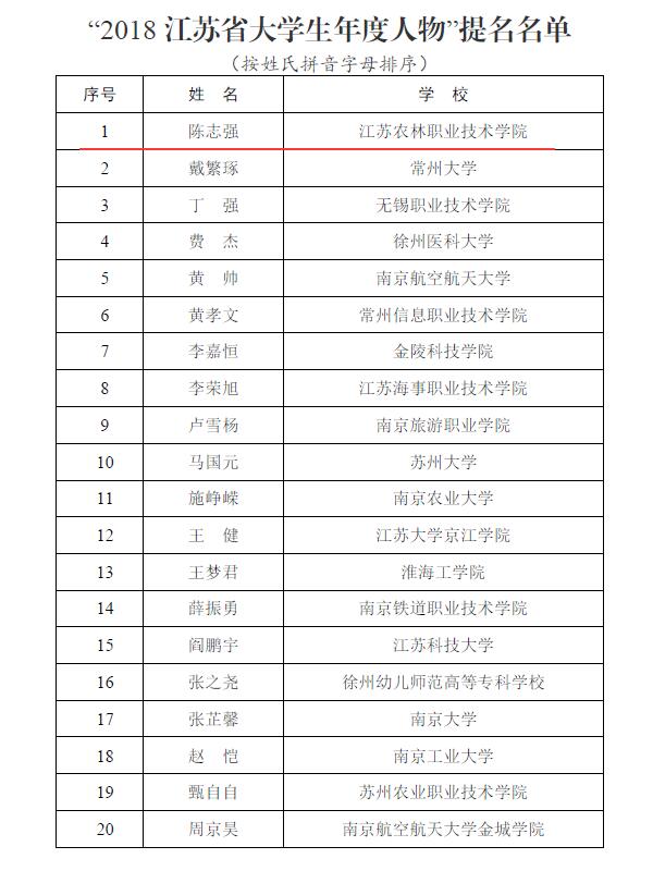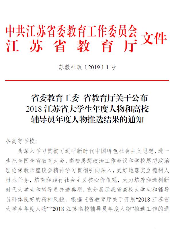 6月22日下午,由中共江苏省委教育工委、江苏省教育厅主办的2018江苏省大学生年度人物和高校辅导员年度人物颁奖典礼在扬州大学举行。经过学院初评推荐、两轮专家评审、风采展评、网络推选,永利官网陈志强同学荣获“2018江苏省大学生年度人物”提名奖。