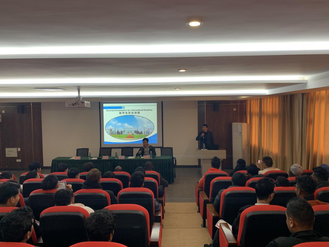 11月20日,学生工作处管斌处长和安全保卫处张义河科长受国际教育学院邀请为全体19级留学生新生作校纪校规及校园安全讲座。管斌处长从课堂学习和校园生活两个方面详细解释了学校有关学生工作的管理规定与细则,他要求在场的同学能够自觉遵守校纪校规、尊重彼此的文化与风俗习惯、注意个人与宿舍卫生、严禁在校园内开展任何形式的宗教活动等,并祝愿所有同学在中国能够不负韶华、学有所成。张义河科长随后从消防安全、交通安全和治安安全三个方面展开,全面介绍了留学生在学校学习生活中要重点关注的安全事项,并在讲座后进行消防灭火演习,提高留学生的遇火自救能力。