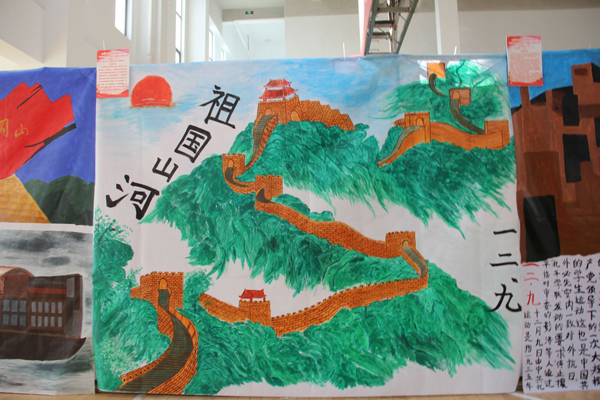 通过前期各班级报名、作品征集,校区团委共收到30余幅喷绘作品。参赛作品内容主要围绕家乡风景、祖国发展、祖国山河、红色文化、家国情怀等主题来呈现。作品《振兴中华》,在锲合一二.九运动的主题下,以学生运动、国家振兴、祖国山河来表达创作者的爱国热情。图的右上方的雄狮觉醒与巨龙傲视表现国家的威严与伟大,正中心是国家地图,上面标出的金星意为一二.九运动游行起义的城市,人民英雄纪念碑表达对英雄的缅怀和崇敬,碑上方的白鸽,象征和平与稳定,图的正上方是祖国的大好河山,作品运用了山水画的画法,体现祖国山水的独特魅力。作品《回望70年》,灵感来源于公交站站牌,将1949年新中国成立作为“始发站”,中间各“停靠点”寓意各时期重大事件,终点站设为“永远”,寓意着新中国的发展能够持续延续下去。2019正值祖国70华诞,作品将“车次”设为70路。画面中带有祥云元素,以此表达参赛者对祖国未来的美好期盼,其次祥云纹是中国古代的经典图纹之一,与现代相碰撞,寓意中华文明源远流长,生生不息。画中的接力棒,意味着新中国薪火相传,前人的接力棒已经交到青年学子手中,青年必将用青春谱写新时代的乐章。