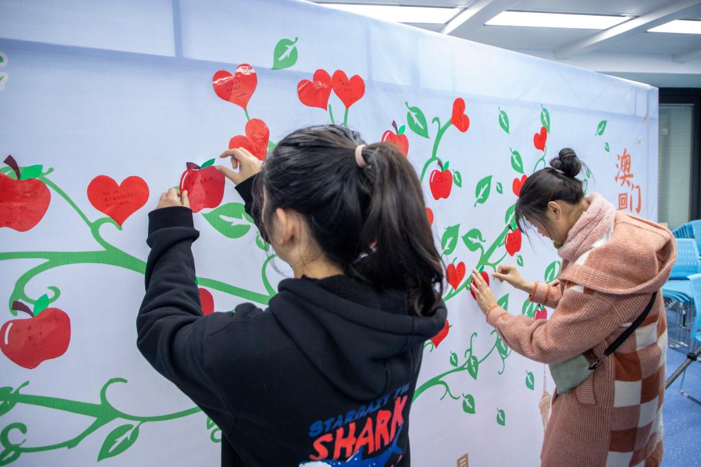 “你可知Macau不是我真姓,我离开你太久了母亲……”一首《七子之歌》拉开了活动的序幕。活动开始,同学们认真观看了“澳门主权移交仪式”短片,带领大家共同走进了澳门回归那段激动人心的时刻。澳门,昔日的南海小城华丽转身,祖国的美丽莲花绽放迷人光彩。“小小一朵莲花,背靠着伟大的胸膛,浮沉顺逆分享分担;住在同一个家,牵着彼此并肩开创,互相守望朝着同一方向……”,《莲成一家》这段音乐短片又向大家展示了澳门如今的勃勃生机,寄喻着澳门回归祖国之后同祖国已经连成一家、连成一体。观影后,同学们纷纷发表了个人感想,集体为澳门点赞。并通过有奖问答的方式,更加深切的感受到澳门回归前后的变化。随后,同学们将对澳门的祝福写在心型贴纸上。一颗颗充满凝聚力的红心贴满了“展望树”,寓意着祖国的明天繁荣昌盛,澳门的未来熠熠生辉。“展望树”挂满红心,和平鸽展翅翱翔,更坚定了我们守护和平的信心。