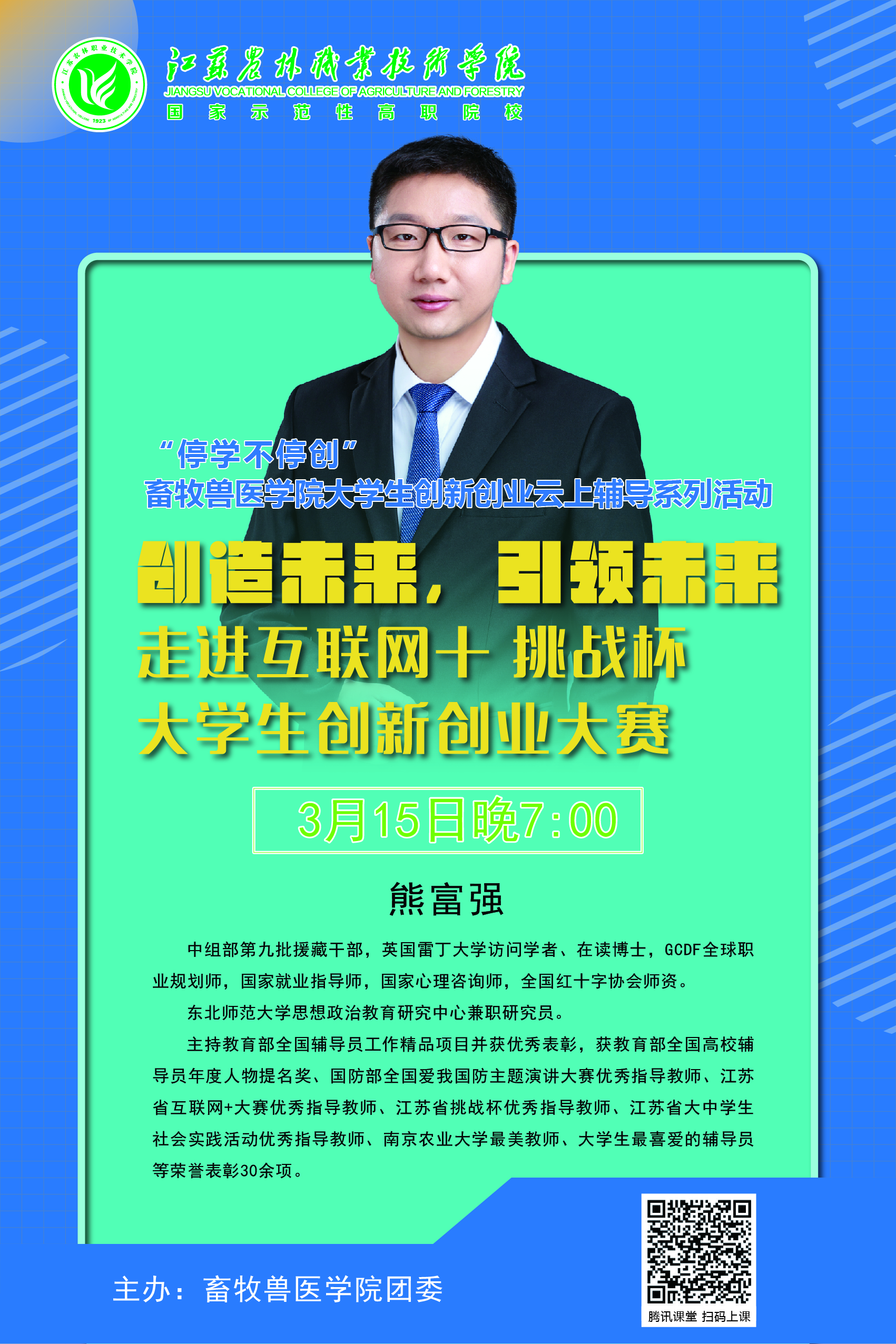 停学不停创。3月15日19:00,畜牧兽医学院团委邀请南京农业大学动物医学院党委副书记熊富强老师,通过云课堂,为大家进行《创造未来,引领未来---走进互联网+挑战杯大学生创新创业大赛》线上培训活动。畜牧兽医学院团委组织全院近300名师生参加了此次讲座。