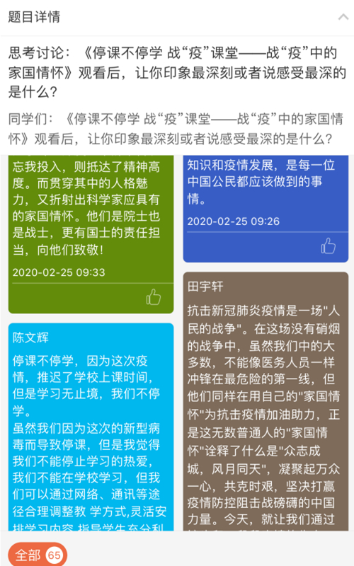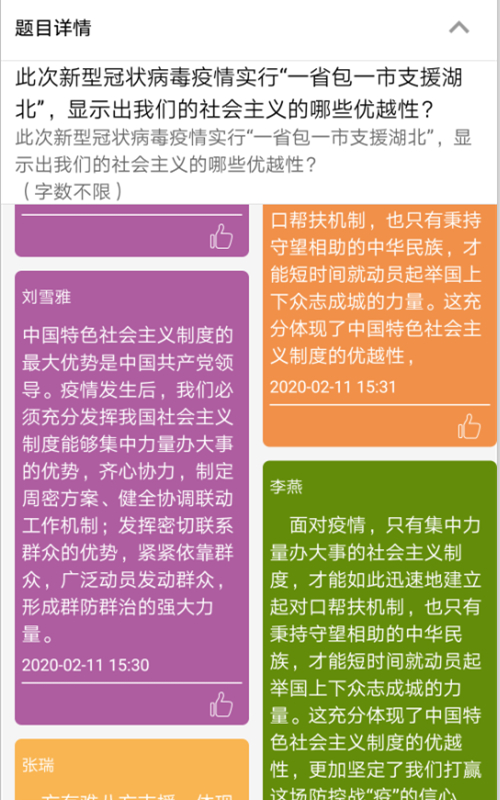 通过集体备课,20余位老师集体商议、共同探讨、互相启迪、积极实践,以“四入”方式,围绕战“疫”谋篇布局:第一,在教学环节中“嵌入”疫情防控的内容,让学生理论联系实际。第二,在教学进程中“插入”全校性的“全国大学生同上一堂疫情防控思政大课”,组织学生观看四位思政大家在线“云”开讲,引导学生理清思路、增强自信。第三,在教学规划中“引入”“战疫小课堂”,帮助学生深化对党的领导、制度优势、人民伟力等问题的认知。第四,在教学实践中“引入”“与子同袍全民战疫”线上社会实践,让学生足不出门也能“实践”,既创新了形式,也深化了互动,效果良好。