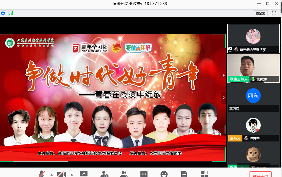 为深入学习习近平总书记给北京大学援鄂医疗队全体“90后”党员的回信精神,引导广大青年切实将习近平总书记向广大青年提出的要求内化于心、外化于行,进一步明确新时代中国青年的责任与担当,4月15日晚,由团委主办、农学园艺学院团委承办的“争做时代好青年——青春在战疫中绽放”线上分享会活动在腾讯会议平台开展。团委、各二级学院(校区)团委全体团干部,近300名团员青年参与了此次活动。