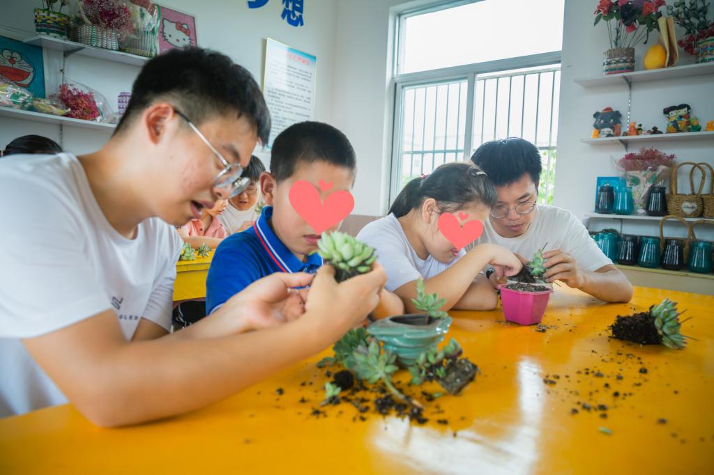 活动中,志愿者们结合学院专业优势,利用园艺疗法相关知识,从认知、情感、社会行为和情绪管理四个方面开展结对帮扶活动,设计花卉识别、艺术插花、多肉组盆、草头娃娃制作等园艺课程活动,提升孩子们的五感体验,帮助他们提高动手能力和适应社会的能力。志愿者们还利用返家实践的契机,奔赴江西、四川、山东等15个地区,围绕企业、社区、智障儿童家庭三个维度开展为期一周的“守望阳关,守护童心”调研活动,发放调研问卷1047份,深入了解智障碍儿童身心发展特点、家庭生活现状及社会大众对智障碍儿童的接纳程度。