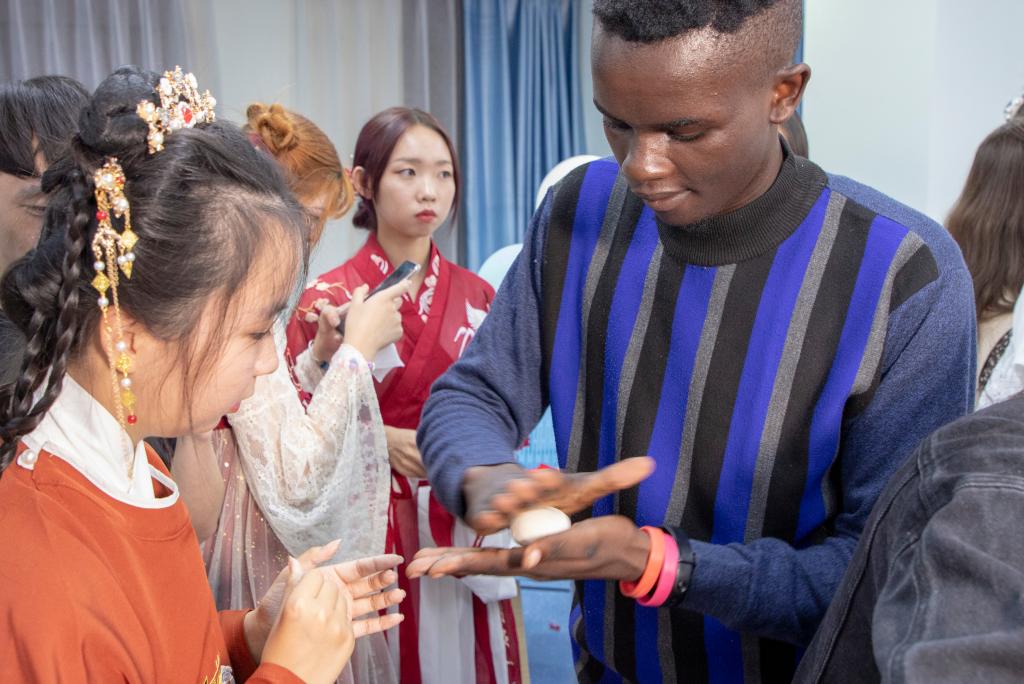 “海上生明月,天涯共此时。”留学生饱含深情诵读中国诗文致敬中华传统文化,领略中华传统文化的博大精深。随后,中国学生指导留学生书写毛笔字,同学们横竖撇捺的认真临摹写活了中国汉字的方正之美。中秋文化精髓在于饮食之美,同学们在相互学习中制作“中秋饼”,从捏饼皮到包芝麻馅,从揉捏成型到下锅烙熟,同学们在欢声笑语中品味中秋,现场其乐融融。此外,活动还设置了茶艺演艺、中外歌曲大联唱等互动环节。品茶、赏月、吟诗、尝美食,“缘来·一家人”打造别具一格的“大团圆”。