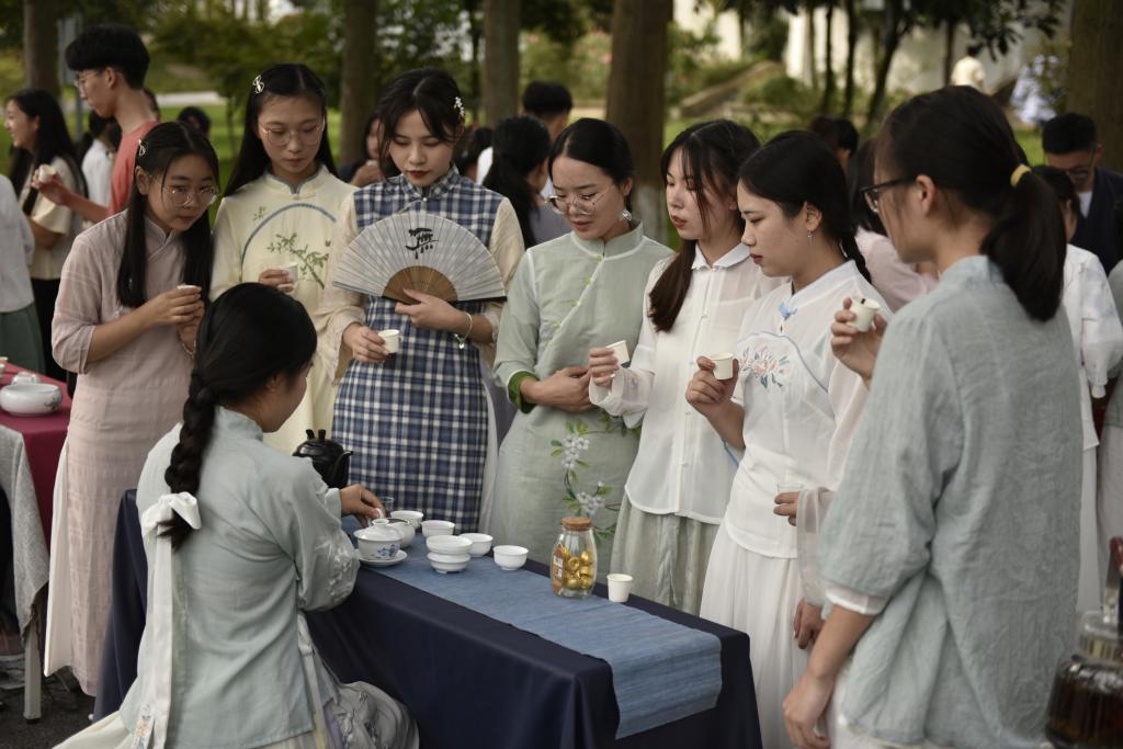 10月2日,由茅山校区团委承办的“共品一杯茶”话家乡茶品鉴活动在校区如火如荼开展。来自各省份不同地区的茶学子,带来南京雨花茶、贵州水城春茶、云南滇红、熟普等20多种家乡的茶。她们身着茶服,为大家奉上一杯茶,并介绍家乡茶的品质特征,18茶艺与茶叶营销班学生还带来了茶调饮、宋代点茶等“绝活”。由经济与人文学院团委承办的“千里寄相思 雅言庆双节”2020年国庆·中秋节日诗词朗诵活动在图书馆朗读亭举行,同学们用真情、挚爱和激情,精彩演绎了《我和我的祖国》《中华颂》《祖国颂》《水调歌头·明月几时有》等广为传颂的名作佳篇,他们或铿锵有力,或抑扬顿挫,深情表达了对祖国的殷殷爱国情,拳拳赤子心。由机电工程学院团委承办的“携手同心,拥抱健康”趣味团体运动会在北校区田径场举行。现场共设四个项目,趣味折返跑,同学们来回飞奔引得现场观众兴奋不已。同心击鼓,6人为一组的游戏,团队合作在这个游戏中发挥了重要作用。蒙眼排球,留学生们表现出色,投中的球最多。六人七足,6人齐心克服重重困难冲向终点。运动会现场加油助威声此起彼伏。由畜牧兽医学院团委承办的“祖国,我为你自豪”户外K歌活动,在南校区食堂门口拉开帷幕。比赛伊始,来自畜牧兽医学院的谭朝阳一首《海阔天空》点燃了全场的气氛。现场K歌选手通过《五星红旗》、《你笑起来真好看》等歌曲尽情演绎个人魅力,欢歌笑语,追逐梦想,校园风采在这里熠熠闪光。一首首歌曲,或空灵,或悠扬,或高亢,或灵动,被选手们演绎得精妙绝伦,赢得了观众的阵阵掌声。
