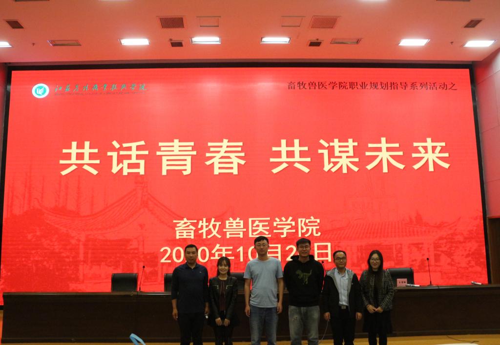 10月20日,畜牧兽医学院职业规划指导系列活动之校友专场在图书馆报告厅举行。来自嘉吉饲料(合肥)有限公司的代宪辰、丹阳市皇塘镇人民政府的刘力、派联宠物医院的翟宁生、南京精艺宠物有限公司的王雪梅等四位优秀毕业生为母校师生分享生涯规划经验,共话人生发展方向。19级畜牧兽医专业以及动物医学专业两百多名学生参与了此次讲座。