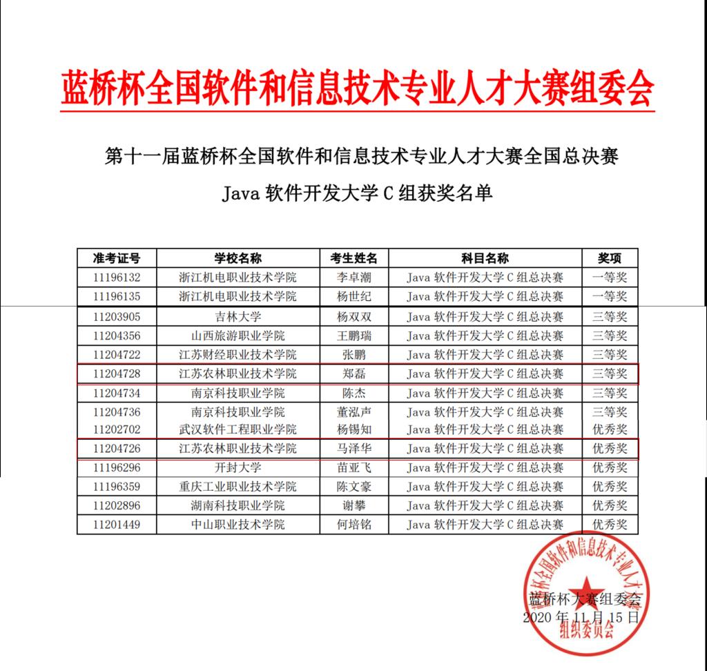 11月14日,第十一届蓝桥杯全国软件和信息技术专业人才大赛个人赛全国总决赛在南京城市职业学院举行,信息工程学院18计算机应用技术1班郑磊同学荣获三等奖,马泽华同学获得了优秀奖。此前,信息工程学院组织了16名同学参加初赛(省赛),获得一等奖2项,二等奖3项,三等奖6项的好成绩。