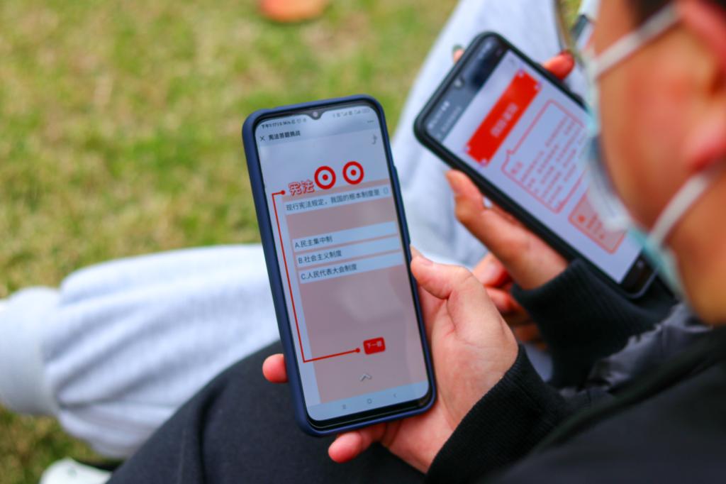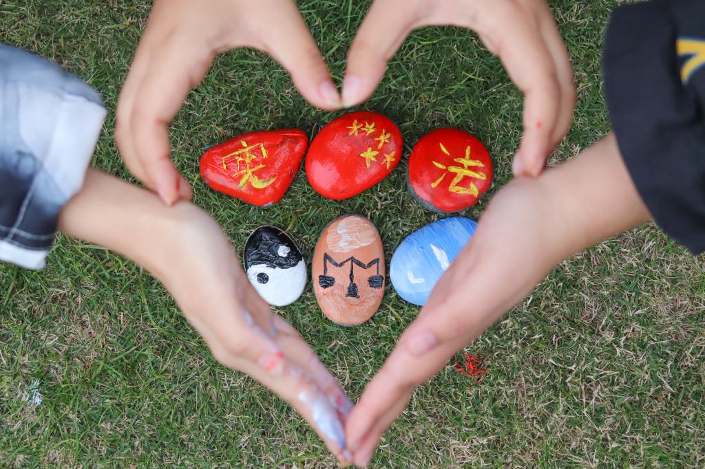 通过线上线下相结合进行普法宣传活动,线上通过制作学法、普法的公众号推文让更多的同学了解我国的宪法,通过制作宪法答题小程序让同学们通过边玩边学的方式参与到学法、懂法中来;线下通过诵读《宪法》,录制微视频制作学法视频供其他同学线上观看,同时开展了“手绘我心中的宪法”活动环节,以鹅卵石为画板,绘画出“天秤”、“五星红旗”等元素,展现了自己内心的宪法世界……朗朗诵读声不绝于耳,条条宪法准则铭记于心。