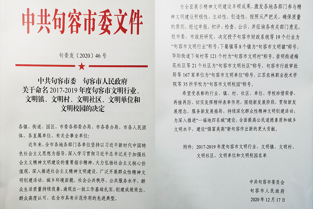 近日,永利官网被中共句容市委、句容市人民政府授予“2017—2019年度句容市文明单位”称号。