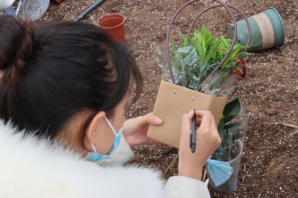 活动中,同学们俩俩组合,利用生活中的废弃塑料杯、碗、盆等为主体,再用些彩纸、画笔加以修饰,做成了一个个别具特色的DIY花盆。接着,在11号大棚里将事先准备好的植物种在了自制的DIY花盆中,大家还在植物和花盆上贴上了对自己、同学、老师的祝福语。