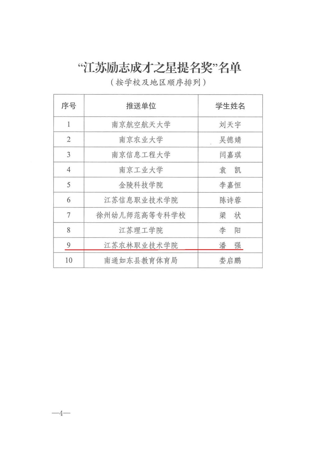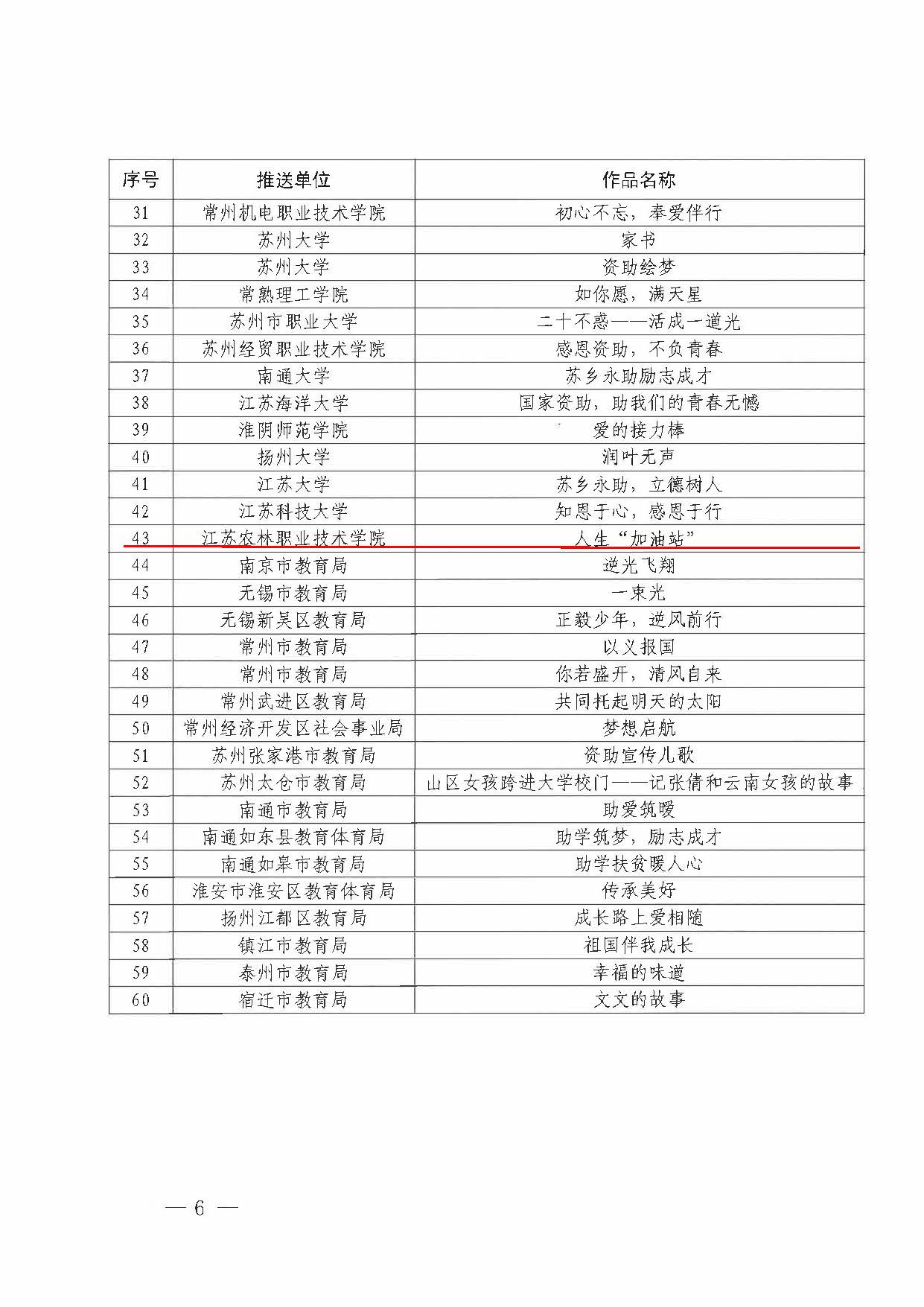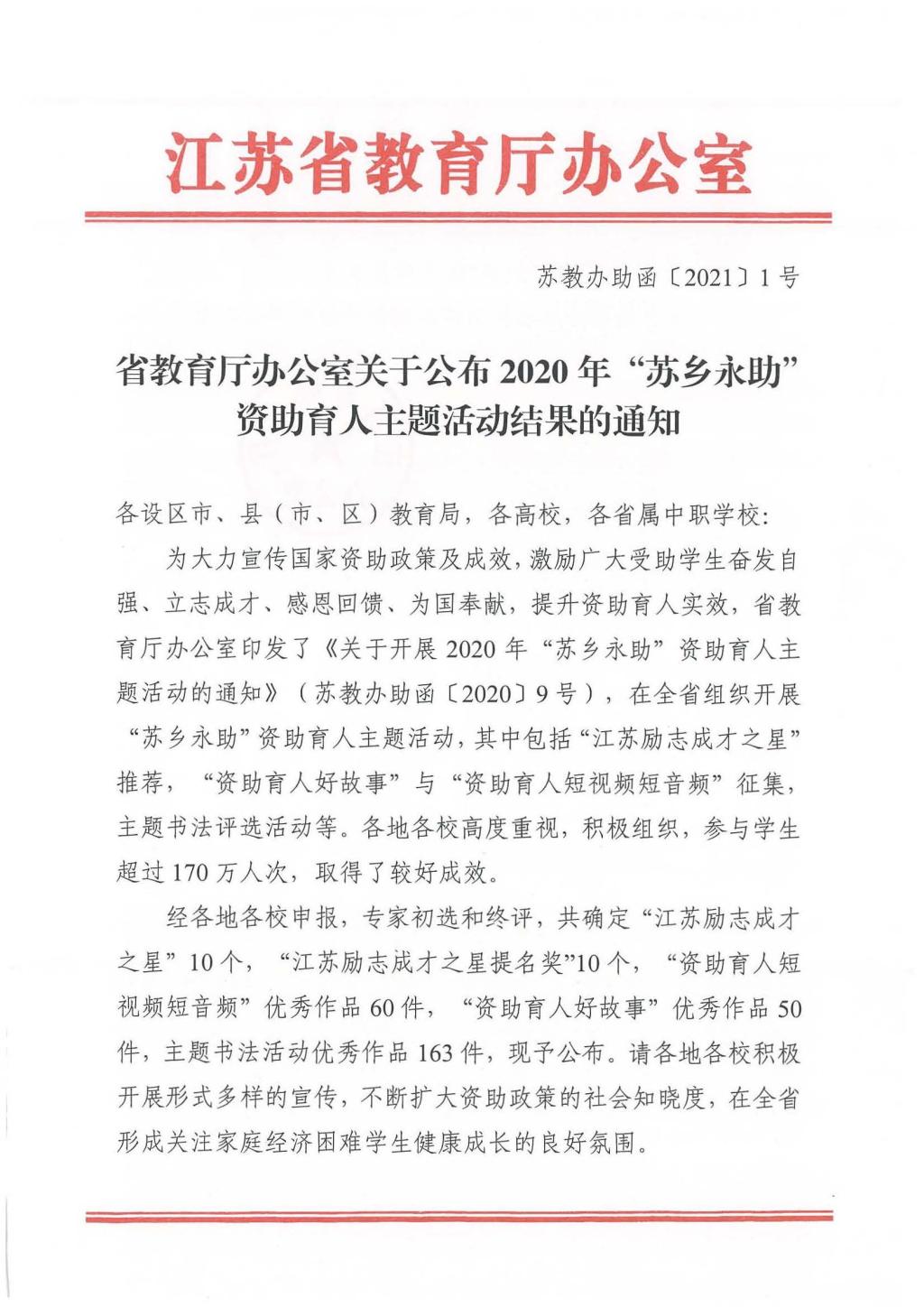 江苏省教育厅主办的“苏乡永助”资助育人主题活动,经专家初选和终评,共确定“江苏励志成才之星”10个,“江苏励志成才之星提名奖”10个,“资助育人短视频短音频”优秀作品60件。