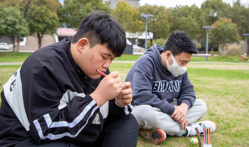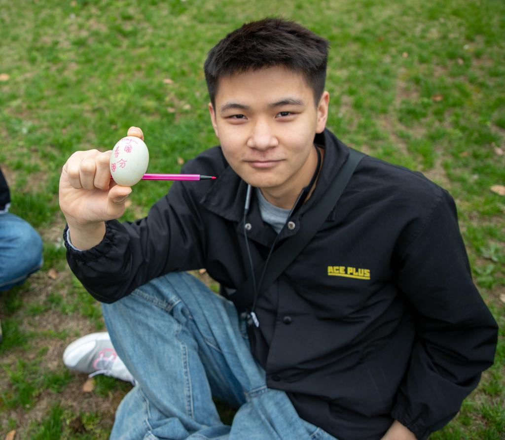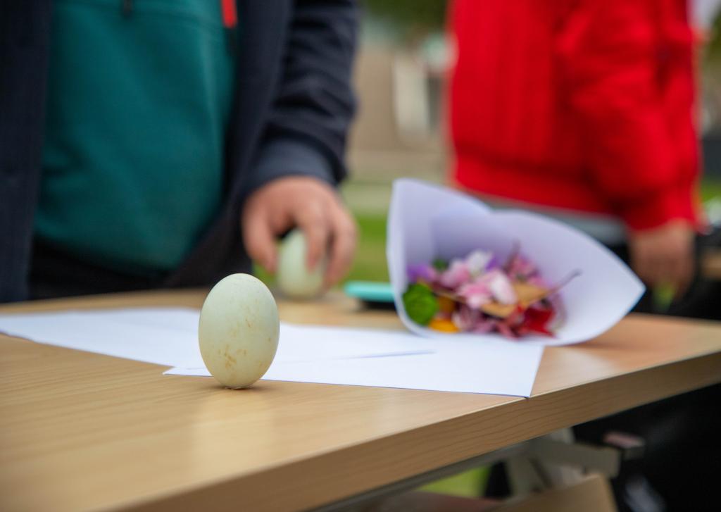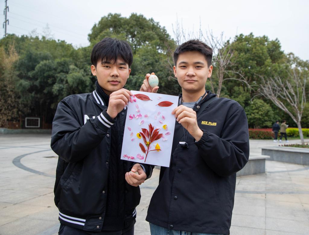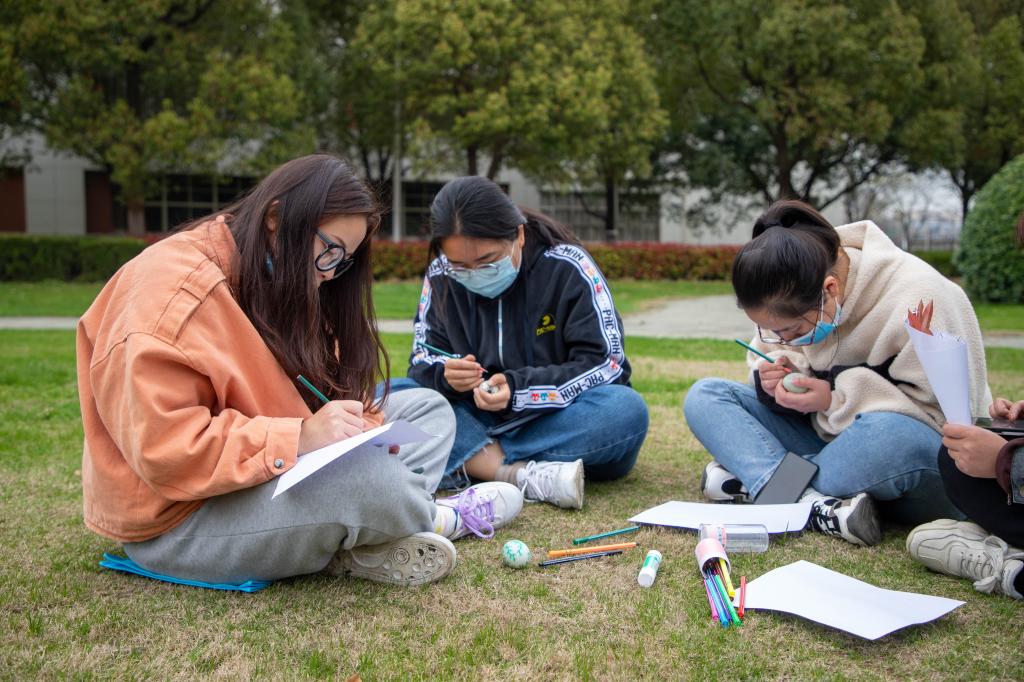 活动开始前,同学们充分了解了春分习俗,其中竖蛋、送春牛及吃春菜等成为同学们交谈的热点,大家共赏诗词,共抒诗意。同学们围在桌前耐心做起“春分竖蛋”游戏。游戏中,大家聚精会神,不一会便成功将蛋竖了起来,现场欢声笑语不断。随后,大家用彩笔在蛋上绘出了一幅幅春色,有的勾勒出春的翠绿,有的刻画出春的艳丽,如同春的画卷栩栩如生。春色满园,皆是花香,同学们拾起落花枝叶,在纸上“镌刻”出春的生机勃勃,留住春天的美好。