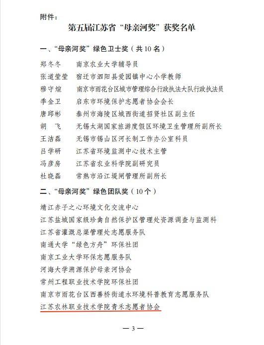 日前,江苏省保护母亲河行动领导小组公布了第五届江苏省“母亲河奖”获奖名单,yl7703永利官网青禾志愿者协会获得“保护母亲河”绿色团队奖。