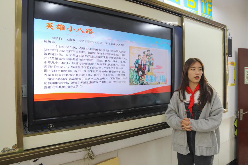 志愿者给同学们讲述了经典故事《英雄小八路》,生动的叙述让同学们身临其境,体会战争年代小小少年也有抗日壮举。在随后的交流环节,同学们踊跃发言,大手拉小手共同铭记红色历史、追寻红色足迹、传承红色基因、弘扬革命精神。