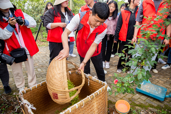 活动在一首欢快的采茶舞曲中拉开帷幕。随后,茅山校区党总支书记汪国好在茶园中带来微党课《铭记光辉历史 争做时代新人》。汪书记从“中国共产党的历史是一部丰富生动的教科书”出发,带领全体党员教师、青年学生回顾了青年一代共产党人的英雄史,并呼吁在场的党员教师,立足岗位,爱岗敬业、争创一流、发扬艰苦奋斗的精神;微党课结束后,师生们身着红马甲,来到茶园,过了一把“茶农”生活。在技术人员的指导下,大家感受到了茶农的艰辛,也体验到了幸福生活的来之不易。