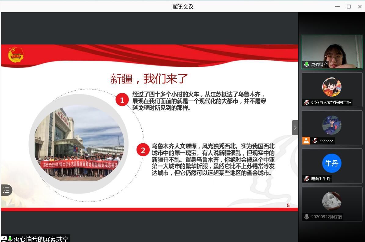 宣讲会邀请了2017-2018年服务西部计划、现任新疆察布查尔县堆齐牛录乡人民政府任民政办主任的罗梦娇和2020年入选苏北计划现服务于灌南县委老干部局办公室的孙存娟。宣讲会上,两位志愿者结合自己的亲身经历,分别介绍了西部计划和苏北计划的工作内容、政策待遇和自己逐步成长的心路历程。在答疑环节中,她们对报名、面试、体检、待遇,以及就业出路等同学们关心的问题一一做了解答。