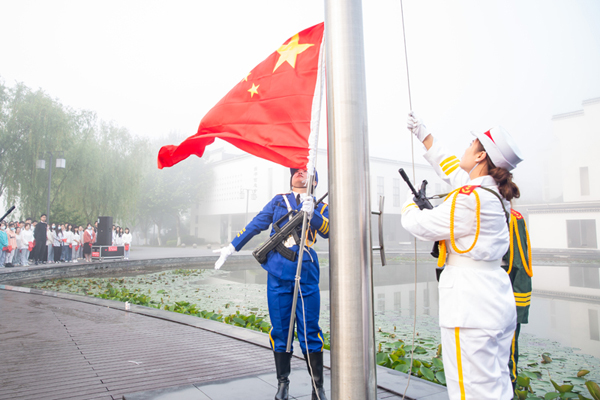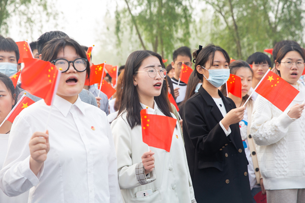 活动现场老团员还进行了重温入团誓词。活动最后,千名青年大学生手摇小国旗,齐唱《歌唱祖国》,歌如海、声如潮、情如涛,一首激情高昂的千人大合唱给本次“国旗下的学党史”画上了圆满的句号。