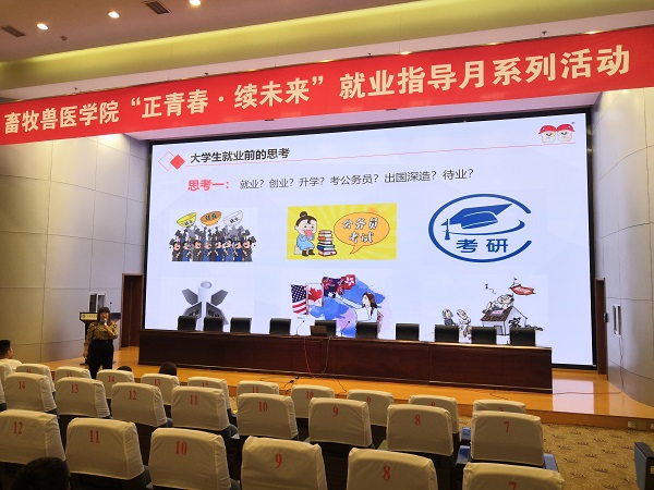 4月28日,畜牧兽医学院在图书馆报告厅举办“正青春·续未来”就业指导月之职业规划讲座,活动邀请了通威集团、双胞胎集团二位人力资源管理师与畜牧兽医学院300余名学生面对面交流。