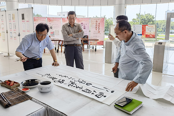 活动现场,书画名家以笔会友,以画沁心,挥毫泼墨,现场创作了近50余幅书画作品,主题鲜明、气势恢宏、内涵丰富,描绘了党的百年历史,祖国万象更新的变化,表达了对中华优秀传统文化的坚定信心和浓浓的爱国情。