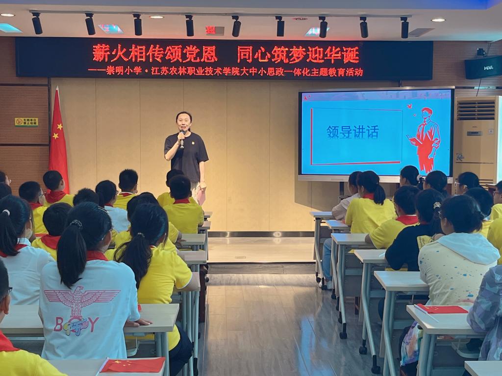 9月29日,马克思主义学院与句容市崇明小学联合举办了“薪火相传颂党恩 同心筑梦迎华诞”大中小学思政课一体化活动。马克思主义学院教师代表、崇明小学党员教师代表和六年级学生共200余人参加了活动。
