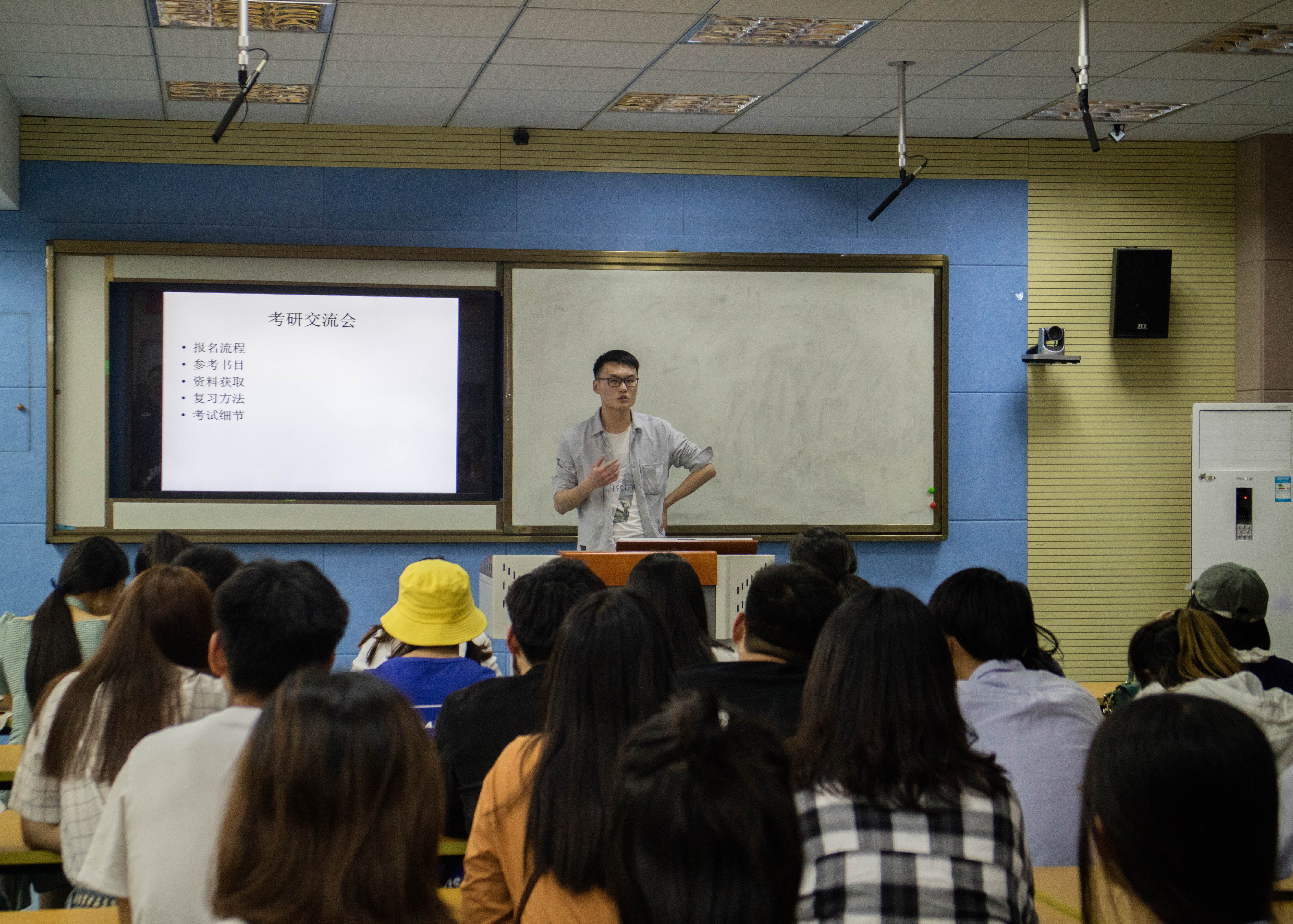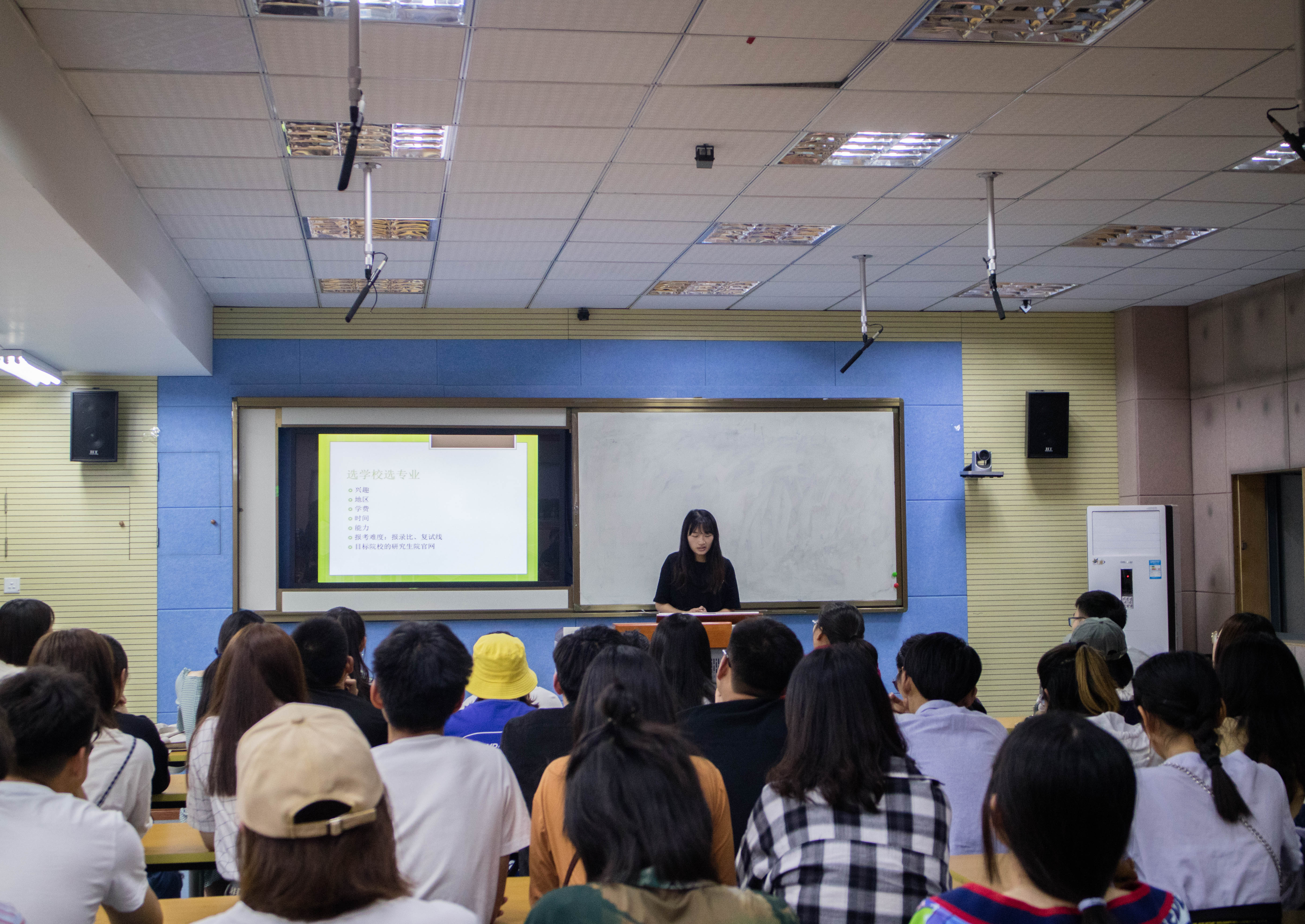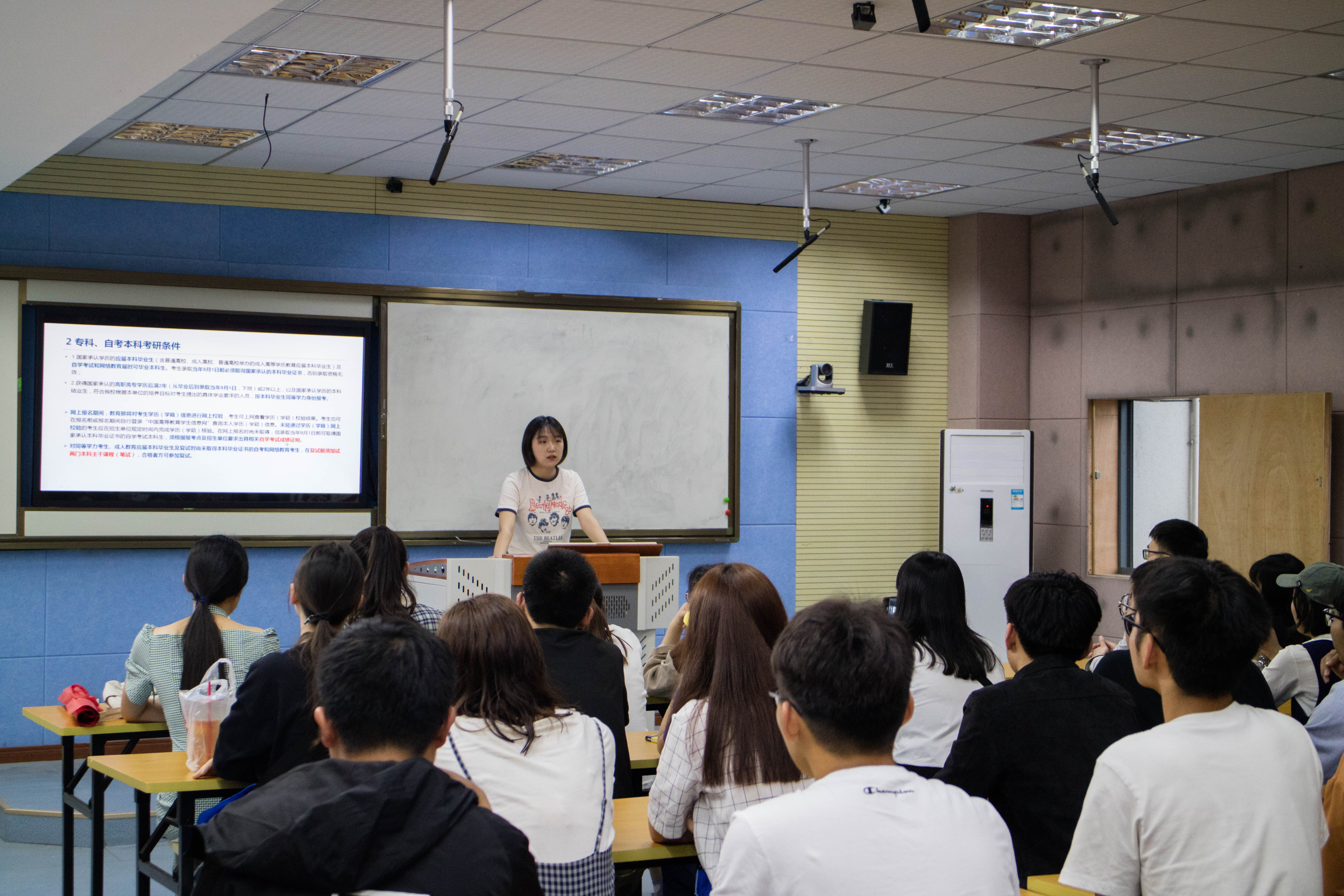 三位毕业生结合自身的考研经验,向在座学生分享了考研的意义、自我学习的方法和经验以及考研报名时的重要要点及过程,交流会现场不时引发阵阵掌声。最后,三位毕业生悉心解答了在场同学的提问咨询。